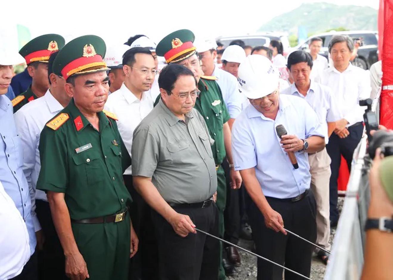Thủ tướng Phạm Minh Chính kiểm tra tiến độ Dự án thành phần 1, cao tốc Châu Đốc - Cần Thơ - Sóc Trăng. Ảnh: SGGP