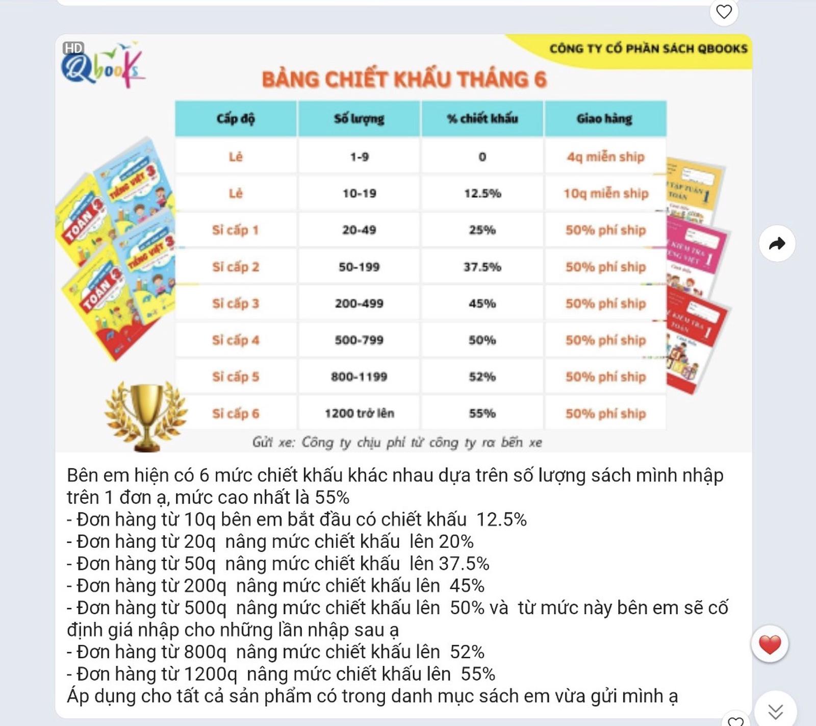 Cụ thể, đối với các đầu sách như bài tập tuần, bài tập hằng ngày, đề kiểm tra, giỏi tính, ôn hè.. (được Công ty Qbooks biên và phân phối) đang có 6 mức chiết khấu khác nhau dựa trên số lượng sách mà khách hàng nhập trên 1 đơn.