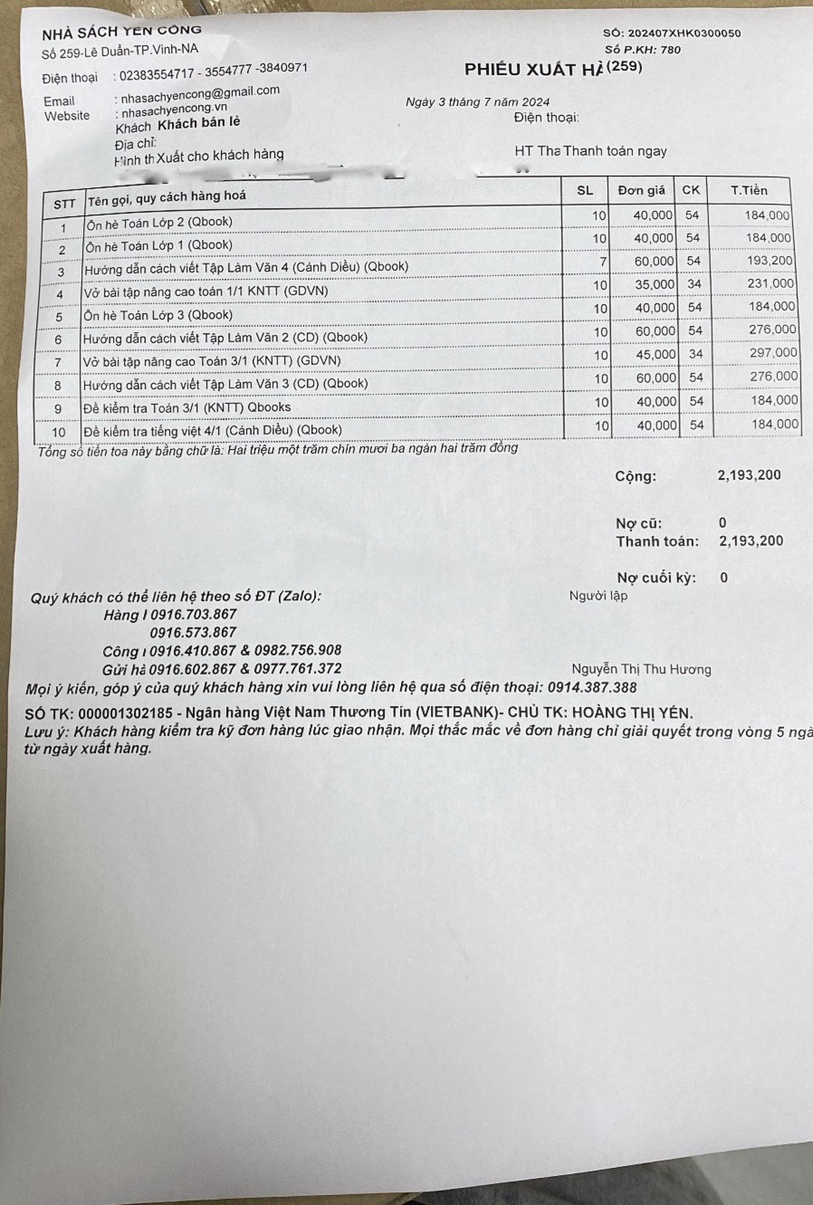 Theo hoá đơn của khách hàng cung cấp, khi mua 10 quyển Ôn hè Toán lớp 2 (Công ty Cổ phần sách Qbooks - địa chỉ tại đường Lê Trọng Tấn, phường Định Công, quận Hoàng Mai, Hà Nội phân phối) tại nhà sách Yến Công với giá 40.000 đồng/quyển, sẽ được chết khấu 54%, tương ứng số tiền phải trả cho nhà sách Yến Công là 184.000 đồng/10 quyển thay vì 400.000 đồng/10 quyển theo giá bìa.