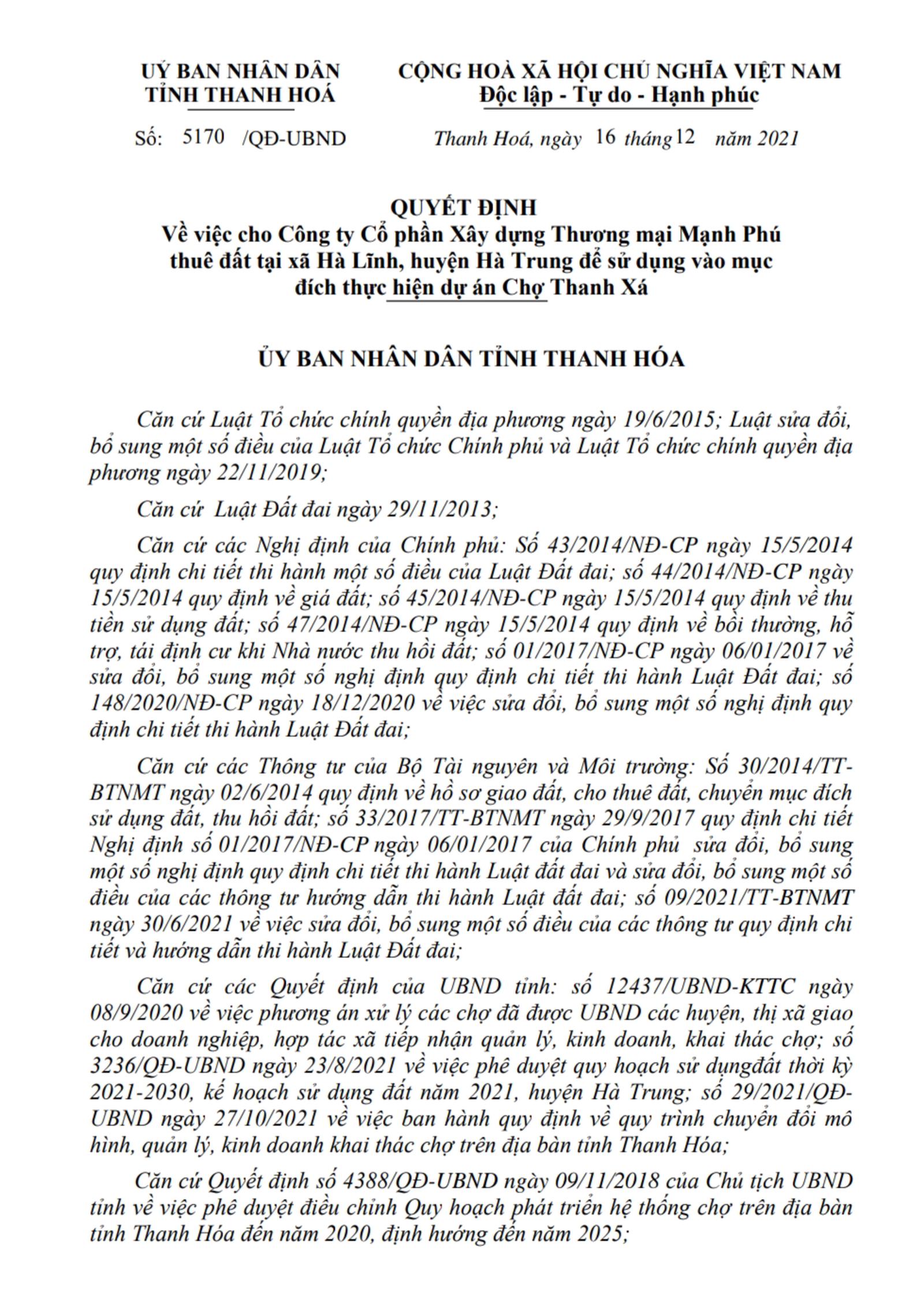 Trước đó, ngày 16/12/2021, ông Lê Đức Giang, Phó Chủ tịch UBND tỉnh Thanh Hóa cũng đã ký Quyết định số 5170/QĐ-UBND về việc cho Công ty Cổ phần Xây dựng Mạnh Phú được thuê đất tại xã Hà Lĩnh, huyện Hà Trung để sử dụng vào mục đích thực hiện xây dựng dự án chợ Thanh Xá.