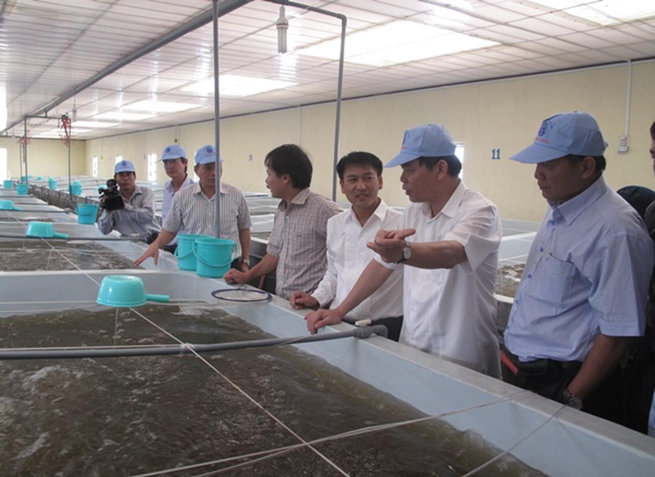 Bộ trưởng Bộ NN&PTNT Nguyễn Xuân Cường thăm cơ sở sản xuất tôm giống thương phẩm tại thị trấn Vĩnh Tân, huyện Tuy Phong, Bình Thuận. Ảnh: TL