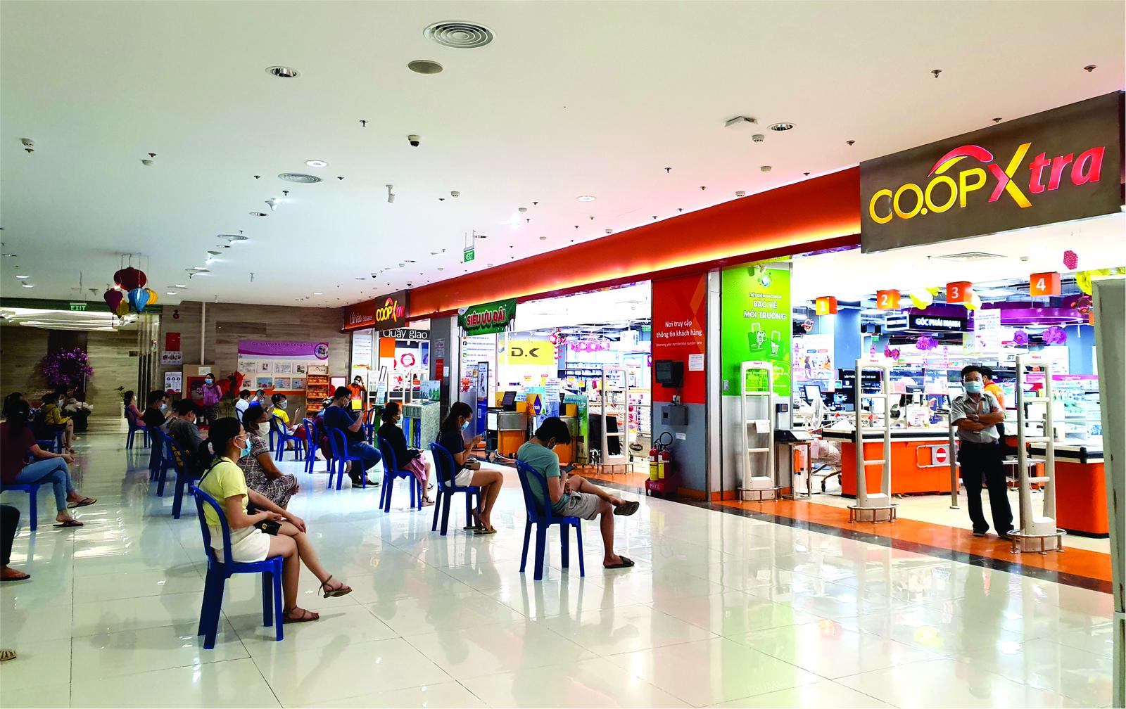 Thực hiện nghiêm giãn cách trước khi vào mua sắm tại siêu thị Co.op Xtra, Trung tâm Thương mại Gigamall, TP Thủ Đức. Ảnh: Đinh Mười