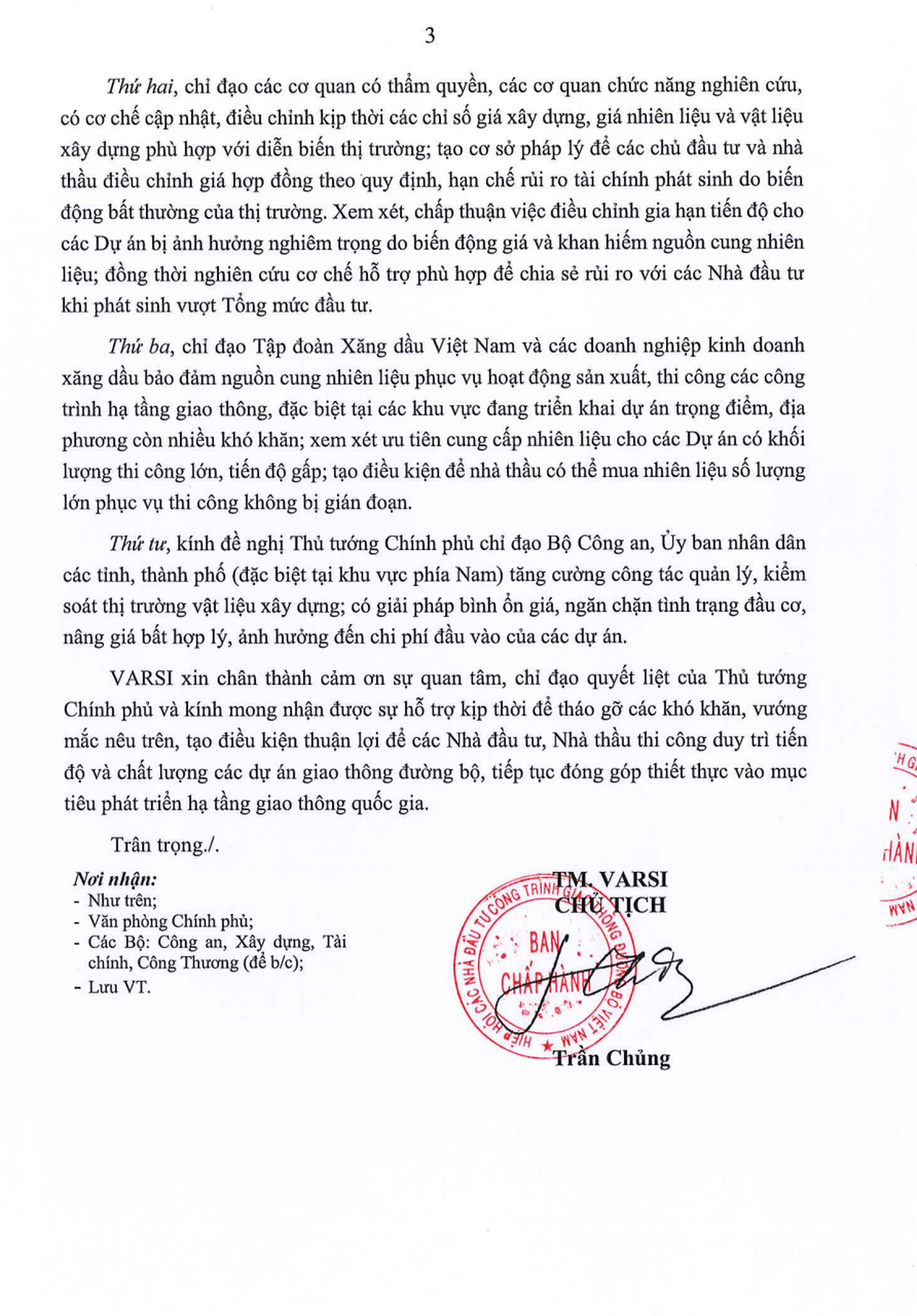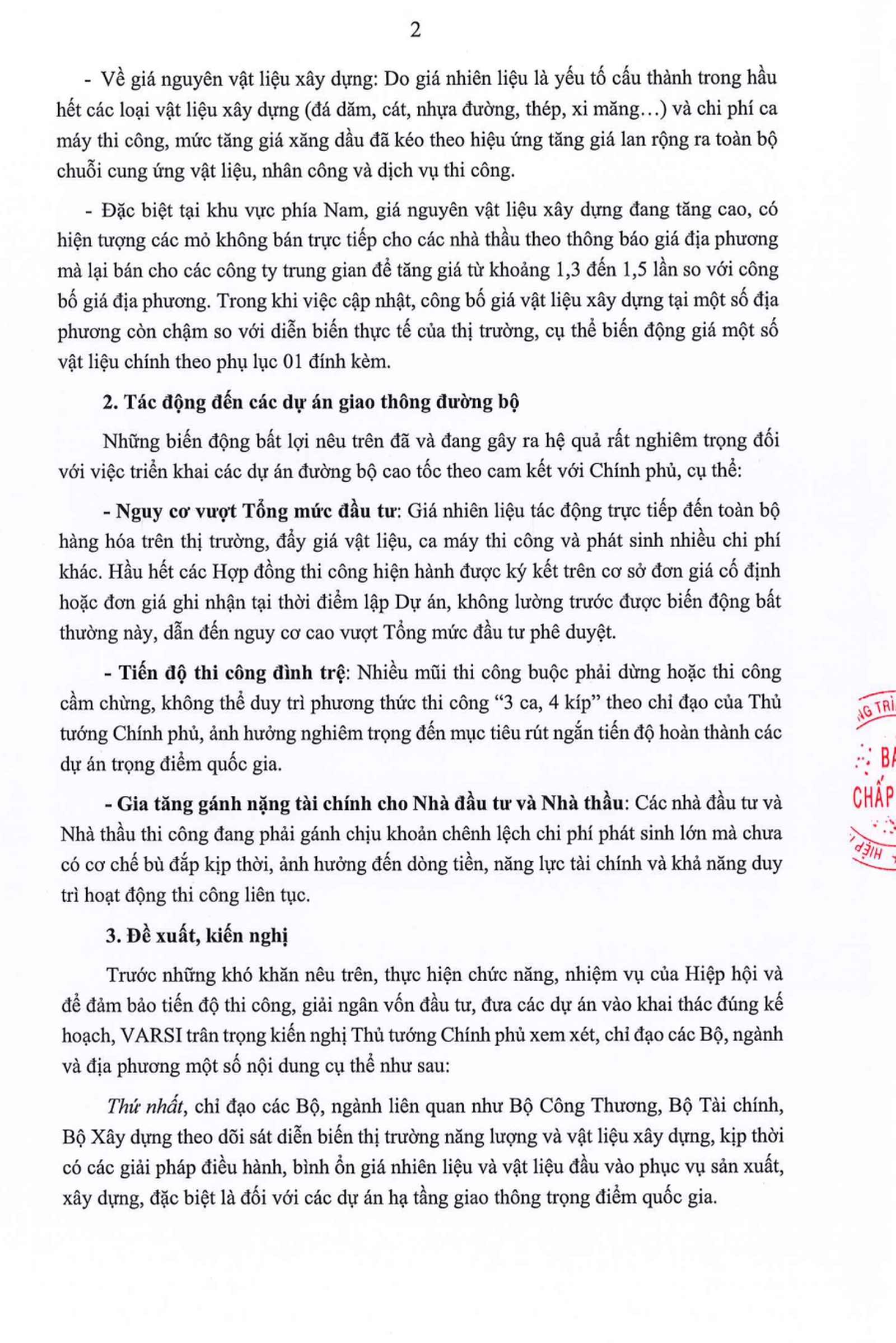 Nhằm ổn định thị trường và tháo gỡ khó khăn cho các dự án hạ tầng, Hiệp hội VARSI cũng đã kiến nghị Chính phủ xem xét chỉ đạo các Bộ: Công Thương, Tài chính và Xây dựng theo dõi sát diễn biến thị trường, có biện pháp bình ổn giá nhiên liệu và vật liệu đầu vào cho các dự án trọng điểm; kịp thời cập nhật chỉ số giá xây dựng, tạo cơ sở pháp lý để điều chỉnh hợp đồng, và xem xét gia hạn tiến độ và cơ chế chia sẻ rủi ro khi phát sinh chi phí vượt tổng mức đầu tư.