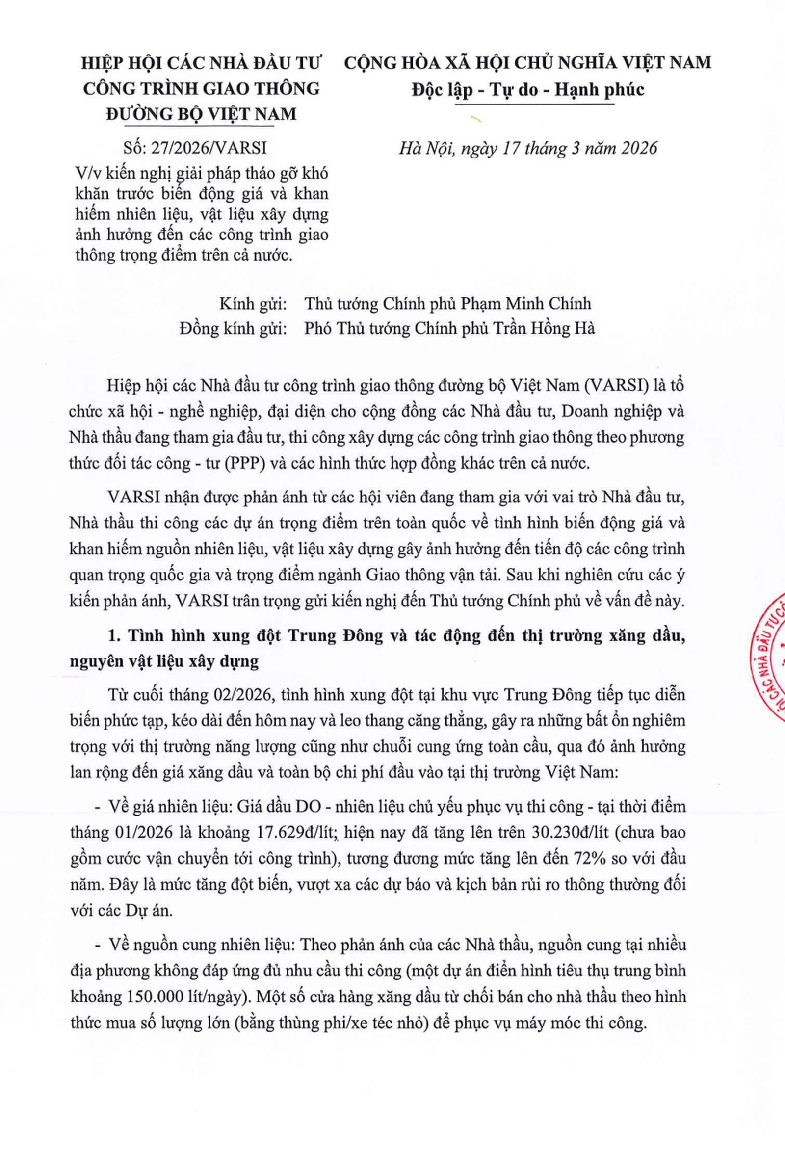 Hiệp hội các Nhà đầu tư công trình giao thông đường bộ Việt Nam (VARSI) vừa có văn bản gửi Thủ tướng Phạm Minh Chính và Phó Thủ tướng Trần Hồng Hà, phản ánh tình trạng giá nhiên liệu tăng sốc và nguồn cung vật liệu khan hiếm đang gây áp lực lớn lên các dự án hạ tầng trọng điểm.