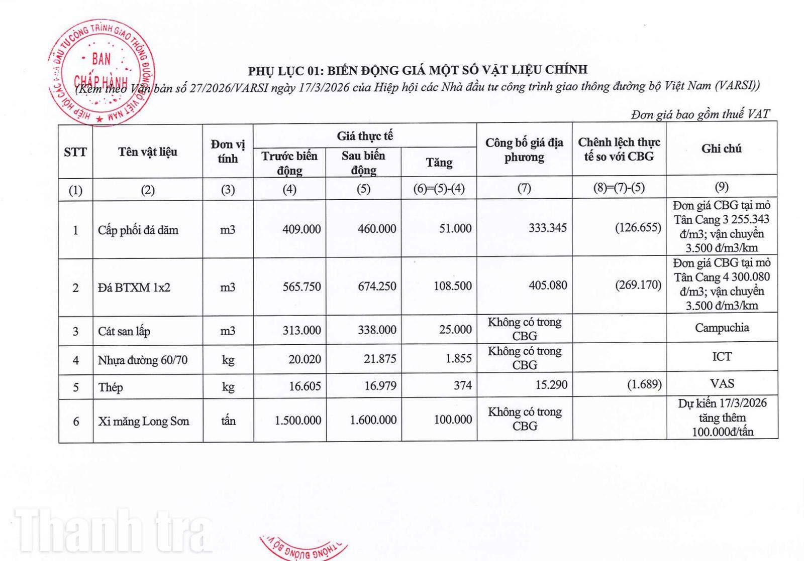 Theo VEC, giá nhiên liệu thời gian gần đây biến động mạnh, nhiều nhà thầu đã kiến nghị các địa phương công bố chỉ số giá xây dựng phù hợp, kịp thời với thực tế biến động thị trường. Tuy nhiên, đến nay chỉ số giá xây dựng của các tháng trong quý I/2026 vẫn chưa được công bố chính thức, gây ảnh hưởng trực tiếp đến công tác thanh toán và triển khai dự án.