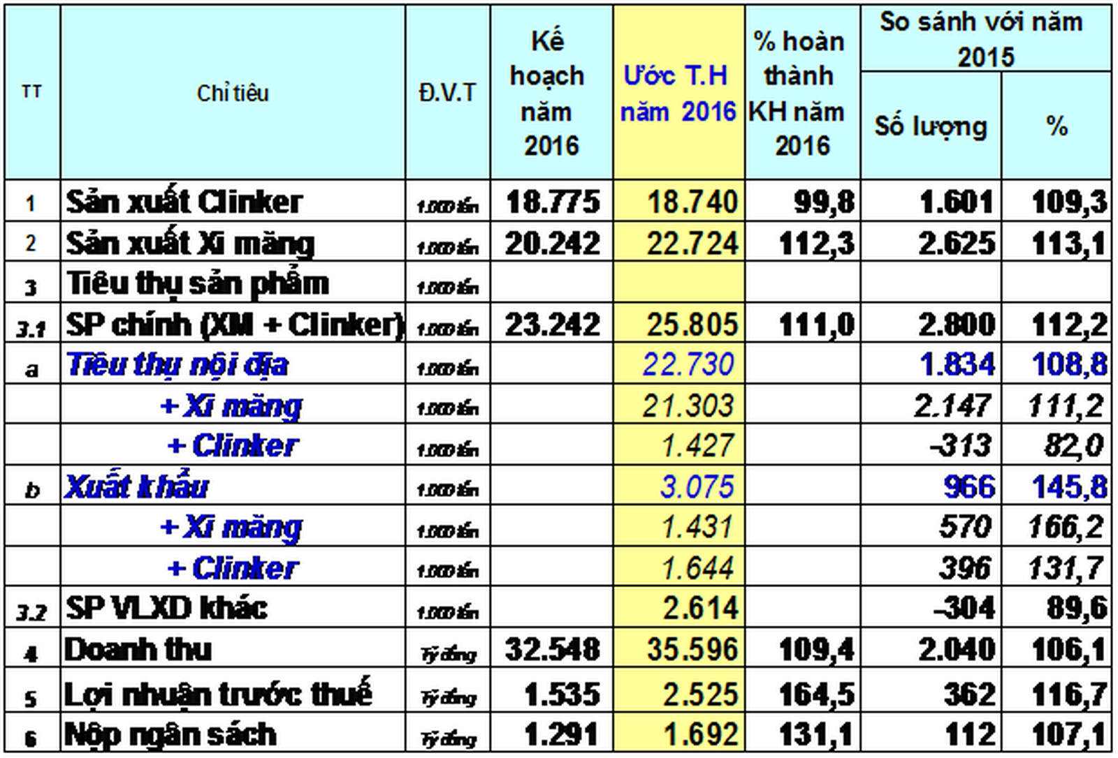 Dù còn có những khó khăn khách quan như tốc độ tăng GDP trong nước không đạt mục tiêu đề ra, trong đó khu vực công nghiệp và xây dựng tăng thấp hơn mức tăng của năm 2015; thị trường xi măng cung vượt cầu; thị trường xuất khẩu xi măng, clinker tiếp tục khó khăn do áp lực cạnh tranh với nguồn cung dồi dào và giá rẻ từ các nước Trung Quốc, Thái Lan và Indonesia; giá đầu vào nguyên/nhiên vật liệu tăng; tỷ giá ngoại tệ biến động ảnh hưởng tới kế hoạch sản xuất kinh doanh…