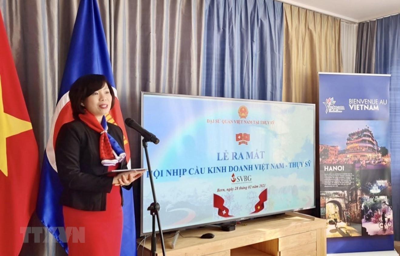 Đại sứ Lê Linh Lan phát biểu tại buổi Lễ ra mắt Hội nhịp cầu kinh doanh Việt Nam-Thụy Sĩ. Ảnh: (Tố Uyên/TTXVN)