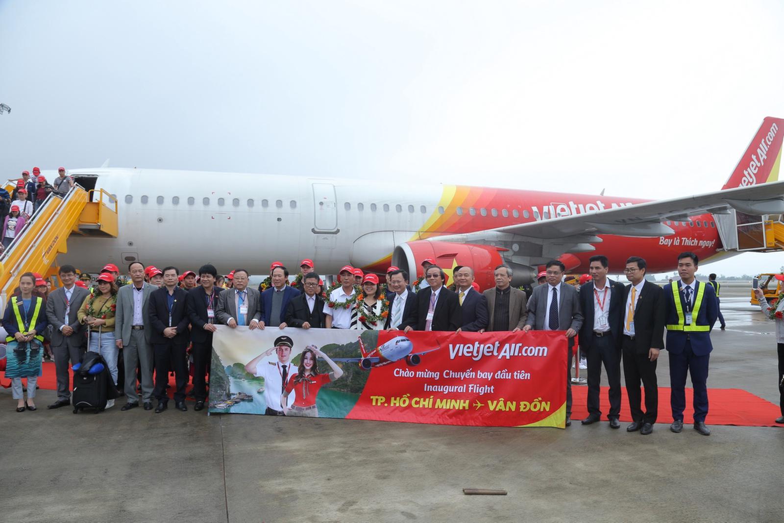Máy bay A321 mang số hiệu VJ230 chở 180 hành khách khởi hành từ sân bay Tân Sơn Nhất lúc 9 giờ 10 và hạ cánh tại sân bay Vân Đồn lúc 11 giờ 25 cùng ngày. Sau nghi thức phun vòi rồng và múa lân chào đón, lãnh đạo UBND tỉnh Quảng Ninh, TP Hạ Long, huyện Vân Đồn đã trao những vòng hoa tươi thắm cho phi hành đoàn và những vị khách đầu tiên.