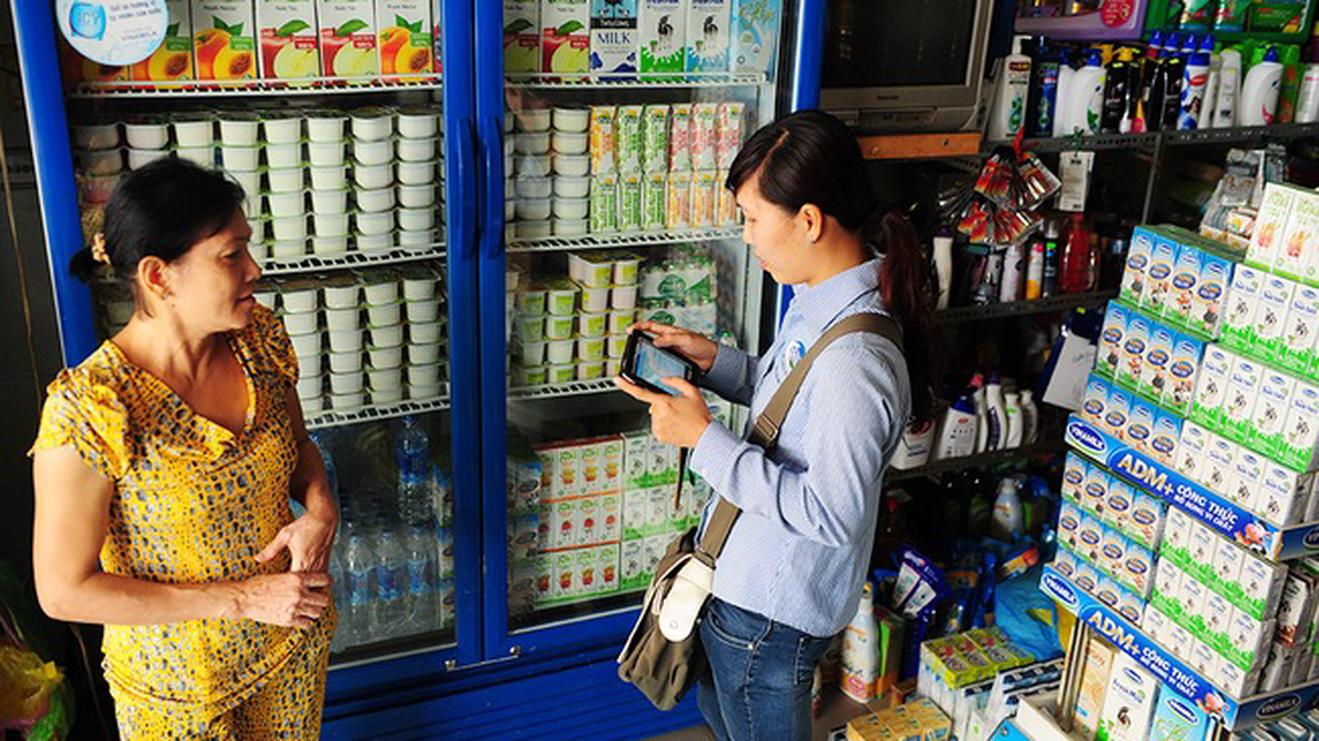 Nhân viên bán hàng của Vinamilk sử dụng phần mềm DMS.One giới thiệu chương trình khuyến mại