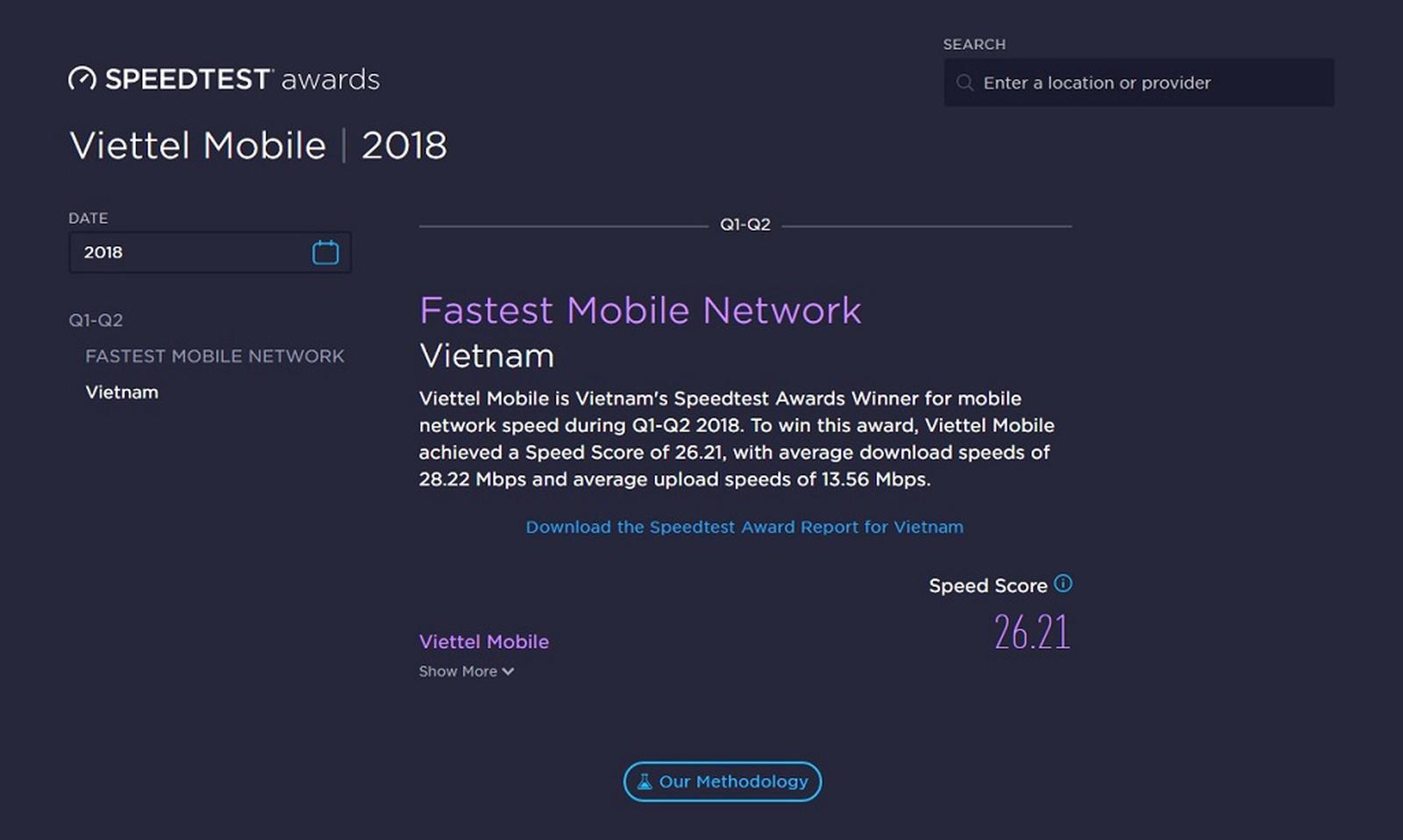 Kết quả được thống kê từ 1,61 triệu kết quả do người dùng tại Việt Nam sử dụng Speedtest trong 6 tháng đầu năm 2018. Cũng theo số liệu Speedtest đo được, mạng di động Viettel chiếm vị trí dẫn đầu về tốc độ trong suốt 3 năm gần đây.