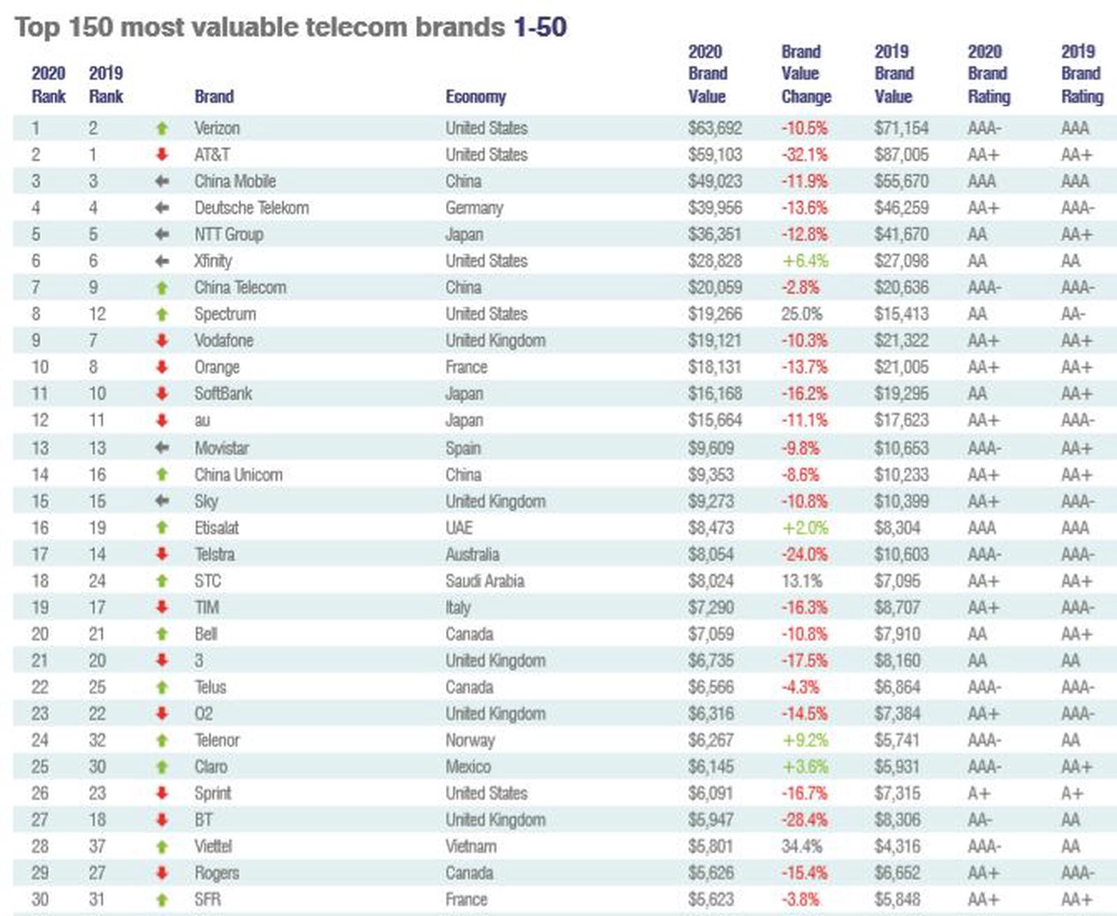 Trong báo cáo của mình, Brand Finance cũng chỉ ra rằng tổng giá trị thương hiệu của nhóm các thương hiệu viễn thông lớn nhất toàn cầu giảm 11% - tổng giá trị năm 2020 đạt 692 tỷ USD so với 777 tỷ USD năm 2019. Cũng trong năm nay, toàn bộ các thương hiệu viễn thông Châu Âu trong top 50 đều giảm giá trị thương hiệu trong năm 2020 với mức giảm trung bình là 13%. Nguyên nhân do sự cạnh tranh ngày càng khốc liệt trong ngành khi các đối thủ liên tục đưa ra các dịch vụ giá cạnh tranh giá và chấp nhận giảm lợi nhuận biên.