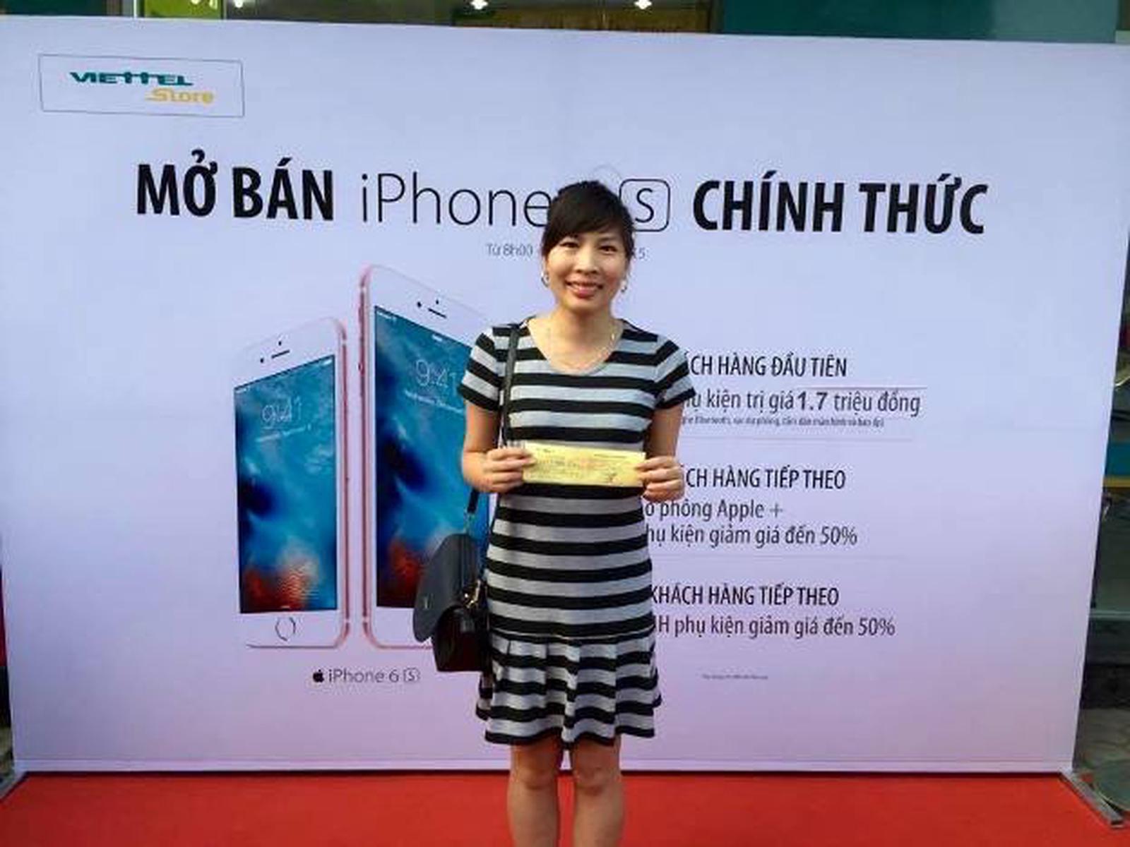 Chị Hoàng Thị Minh Phương - khách hàng của Viettel Store 145 Thái Hà khoe siêu phẩm iPhone 6S Plus 64GB tại cửa hàng 145 Thái Hà. Ảnh: VT