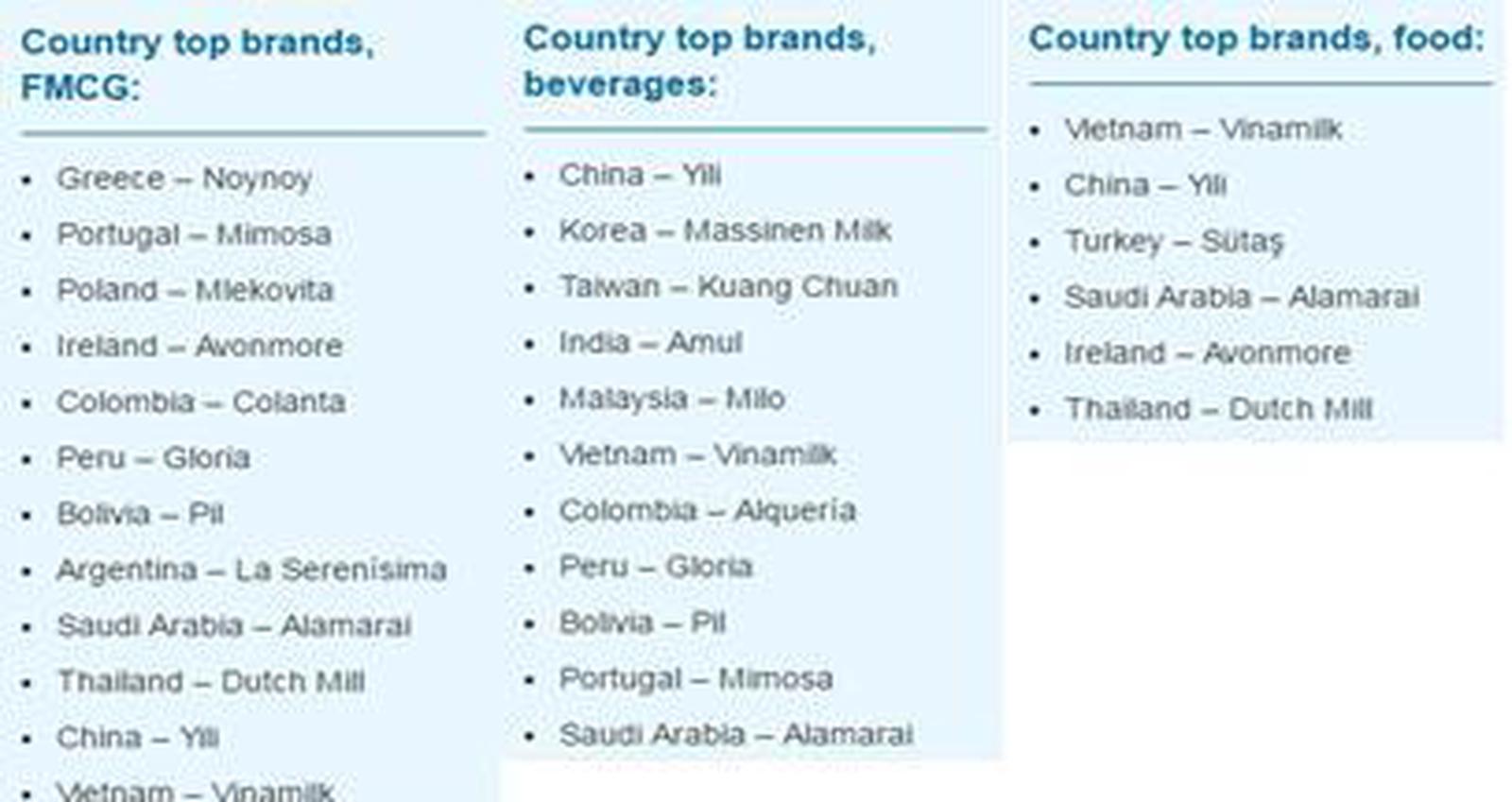 Công ty Cổ phần Sữa Việt Nam (Vinamilk) được đánh giá là nhãn hiệu dẫn đầu tại Việt Nam thông qua 3 hạng mục: Hàng tiêu dùng nhanh (FMCG), nước giải khát và thực phẩm.
