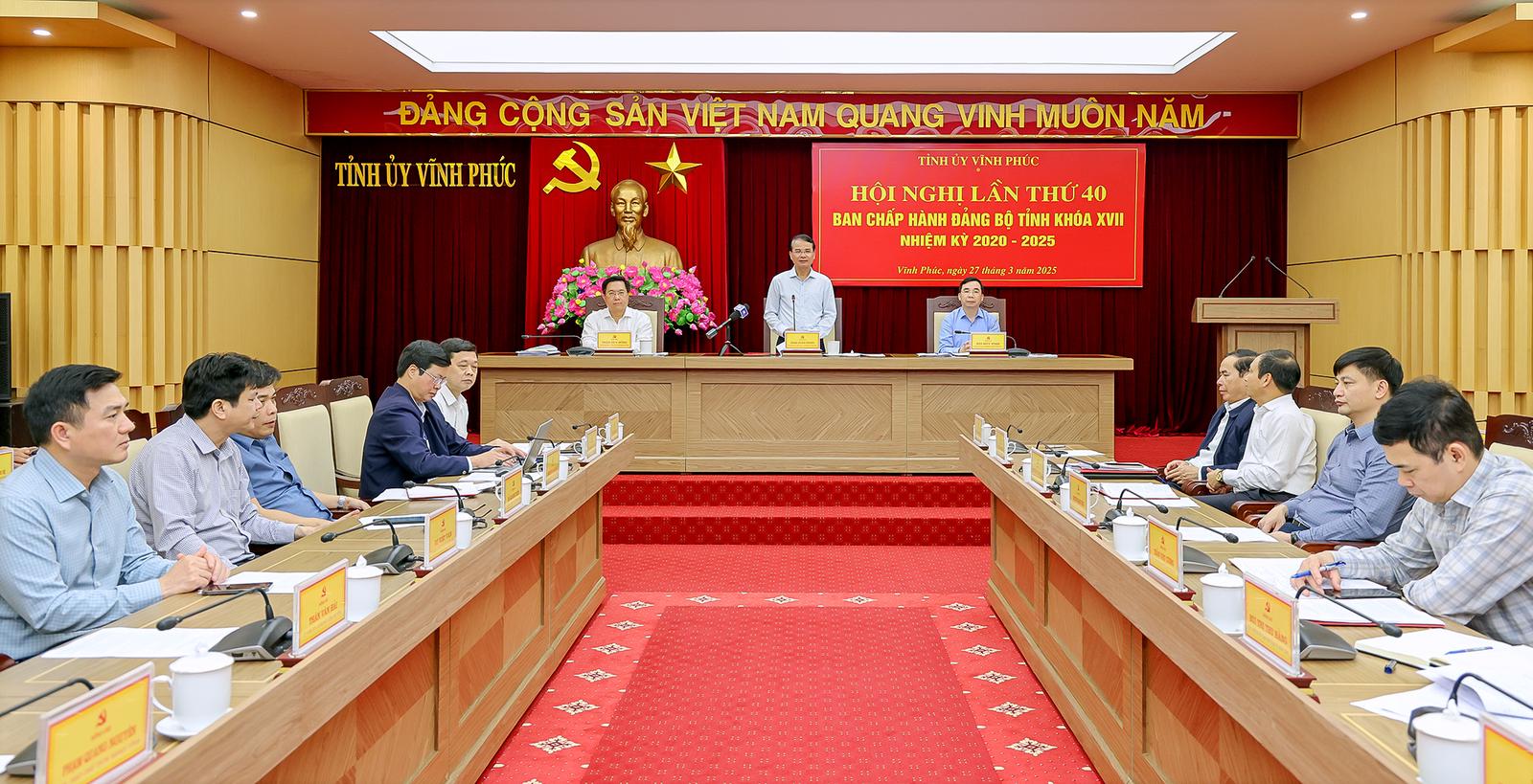 Ngày 27/3, Ban Thường vụ Tỉnh ủy Vĩnh Phúc triệu tập Hội nghị lần thứ 40 Ban Chấp hành Đảng bộ tỉnh khóa XVII, nhiệm kỳ 2020-2025 cho ý kiến vào dự thảo báo cáo kết quả thực hiện nhiệm vụ quý I và nhiệm vụ trọng tâm quý II; chủ trương điều chỉnh kế hoạch đầu tư công trung hạn giai đoạn 2021-2025, kế hoạch đầu tư công năm 2025 và quán triệt một số văn bản mới của Trung ương.