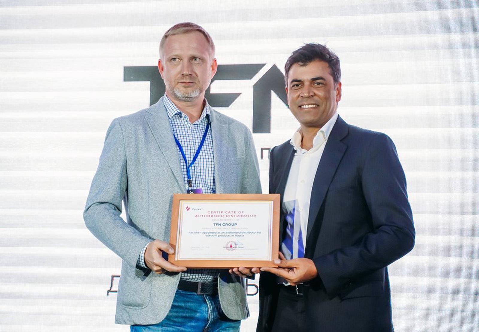 Ông Dmitry Saftenko (trái) - Phó Chủ tịch TFN Group - nhà phân phối chính thức của VinSmart tại Nga nhận chứng chỉ từ ông Mantosh Malhotra - Phó Tổng Giám đốc Tập đoàn Vingroup