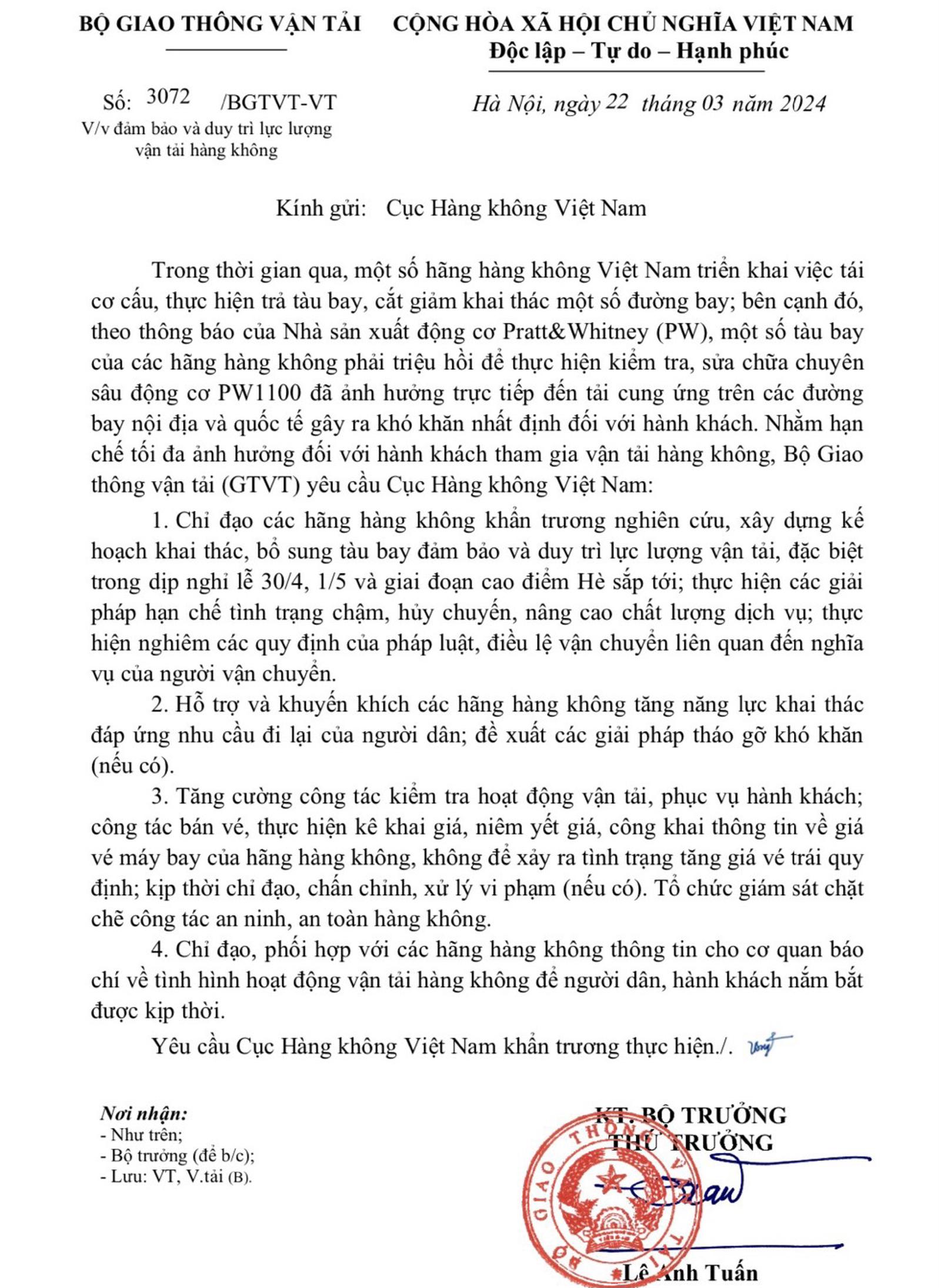 Văn bản số 3072/BGTVT-VT ngày 22/3/2024 của Bộ GTVT. Ảnh: TQ