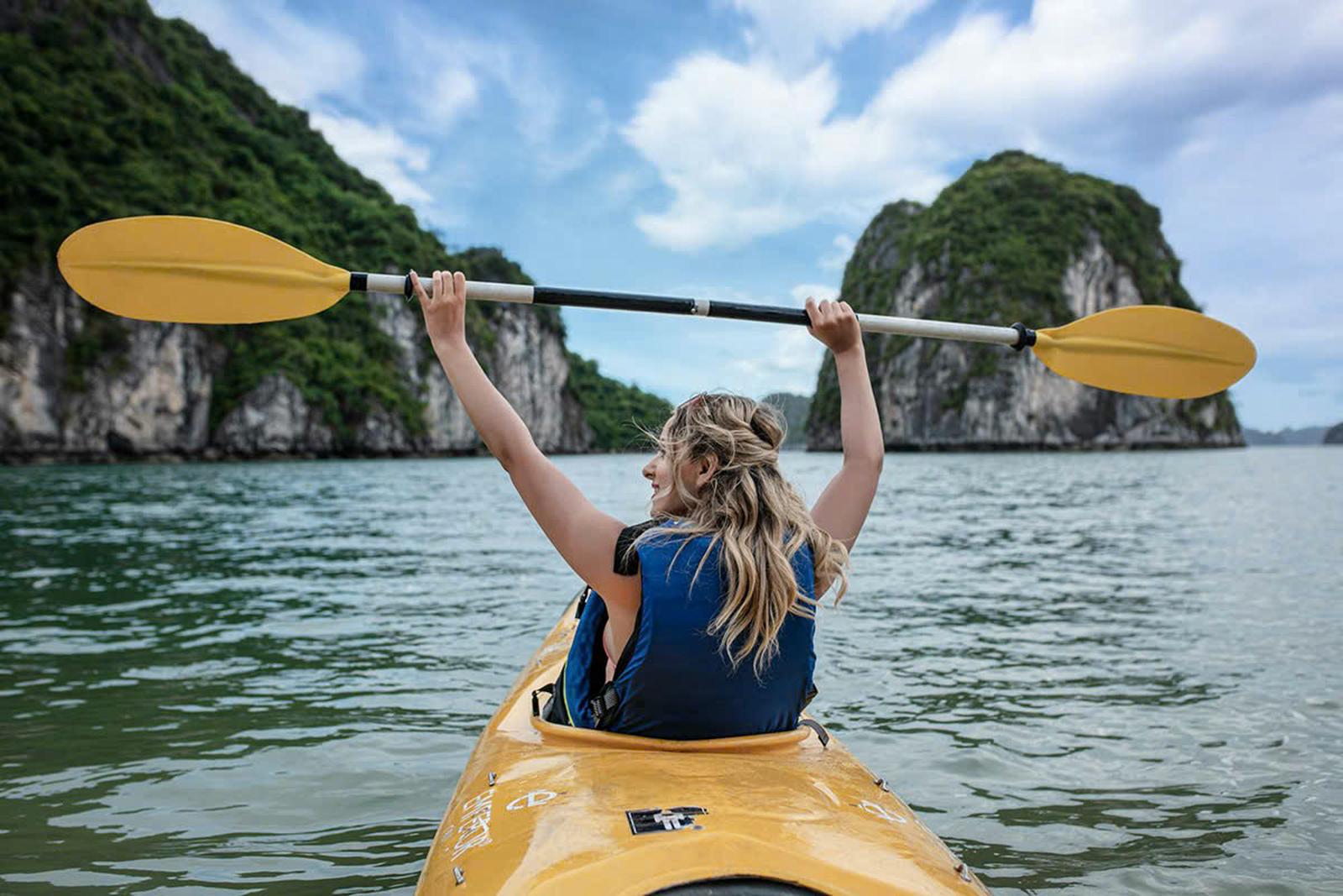 Du khách nước ngoài chèo kayak trên vịnh Lan Hạ. Ảnh: LC