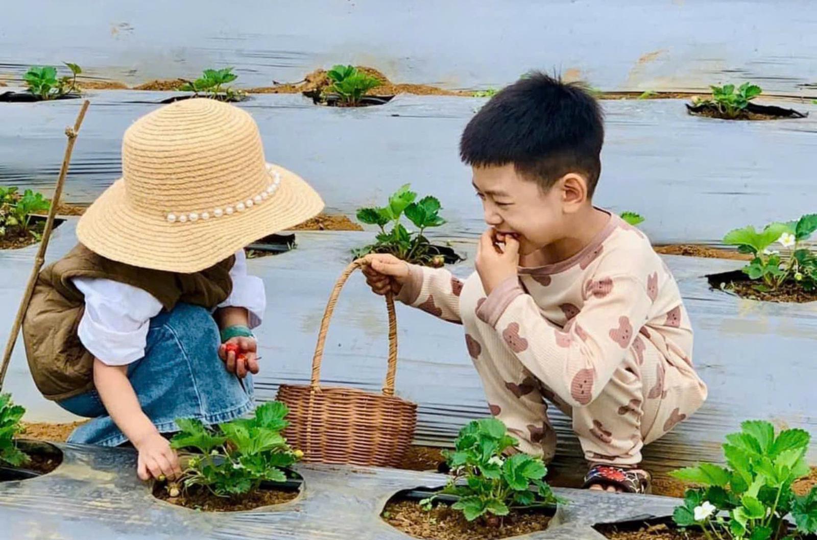 Du khách trẻ em thích thú khi tự tay hái dâu tây tại vườn. Ảnh: P.B