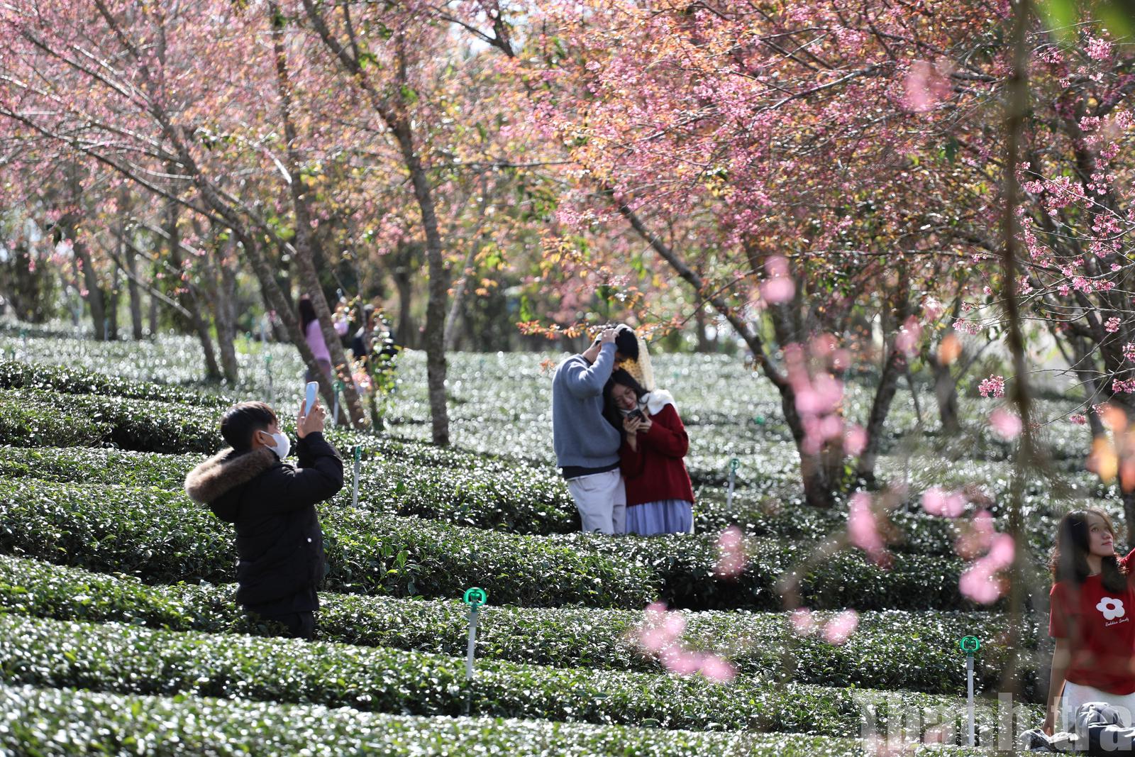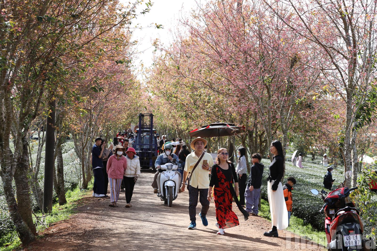 Nơi đây, mai anh đào đang nở rộ và được nằm xen lẫn giữa những hàng chè xanh ngát, thẳng tắp, tạo nên một bức tranh thiên nhiên tuyệt đẹp khiến du khách mê mẩn.
