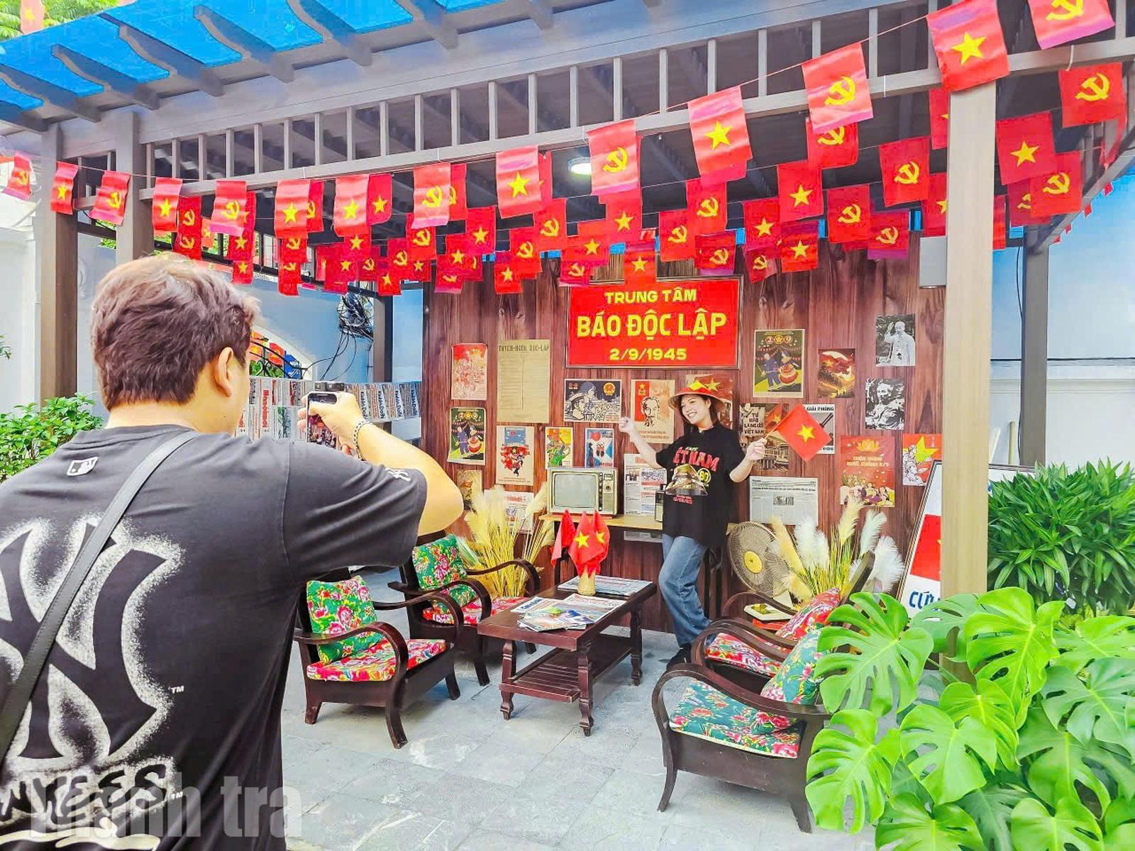 Bên trong khuôn viên Tung tâm Báo chí Thủ đô khéo léo trang trí kết hợp cờ hoa với ánh đèn, trở thành điểm “check-in” độc đáo. Ảnh: HH