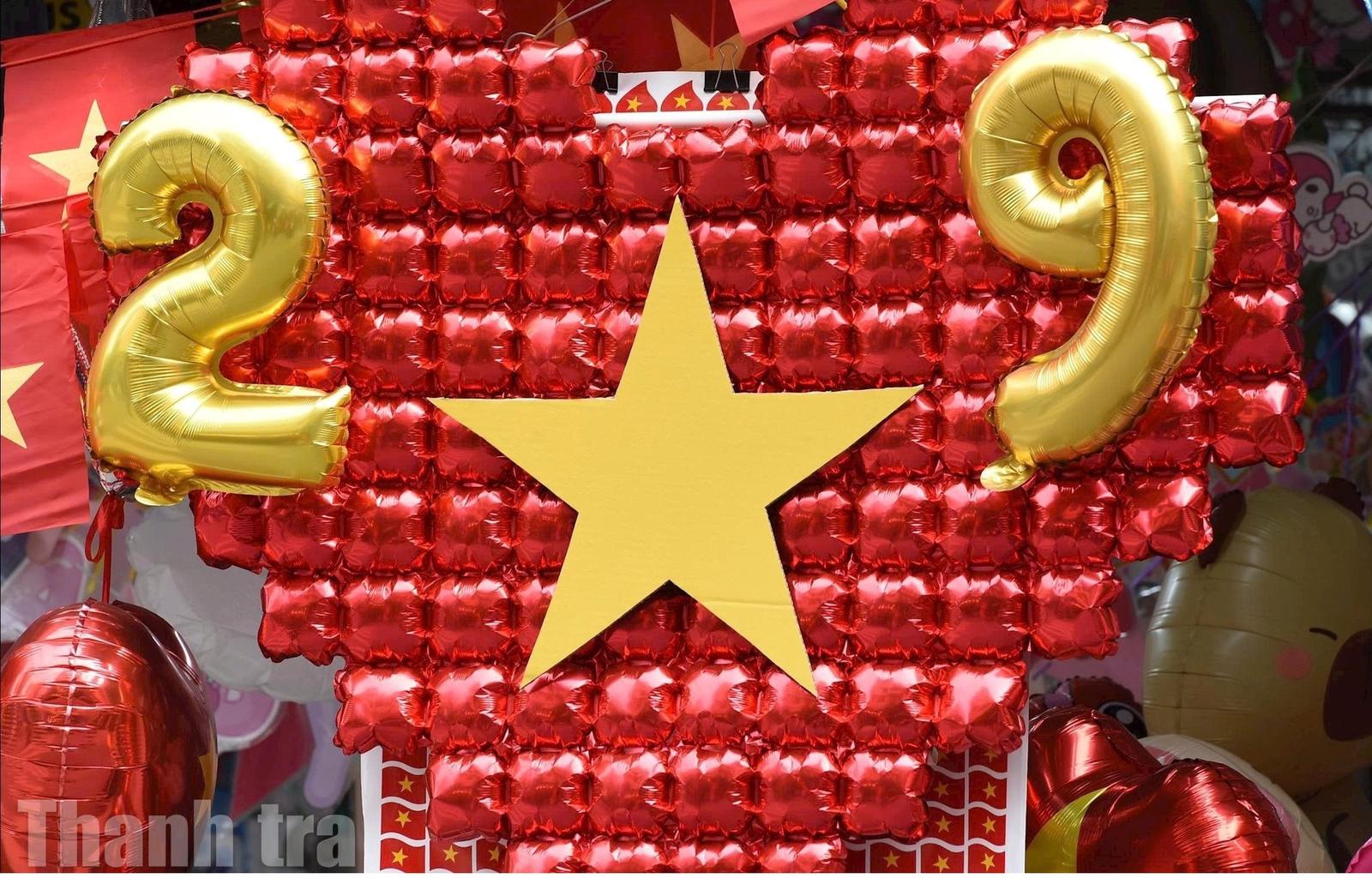 Một trong những con phố nổi bật, thu hút đông đảo người dân đổ về trong những ngày này là phố hàng Mã, phường Hoàn Kiếm. Dọc tuyến phố, hàng nghìn lá cờ mini kết thành mái vòm đỏ thắm, tựa như bức tranh sống động dệt bằng tình yêu Tổ quốc. Các cửa hàng đồng loạt bày bán nhiều món đồ mang đậm dấu ấn Quốc kỳ như lá cờ, bóng bay, mũ nón, móc khoá, khăn, áo...