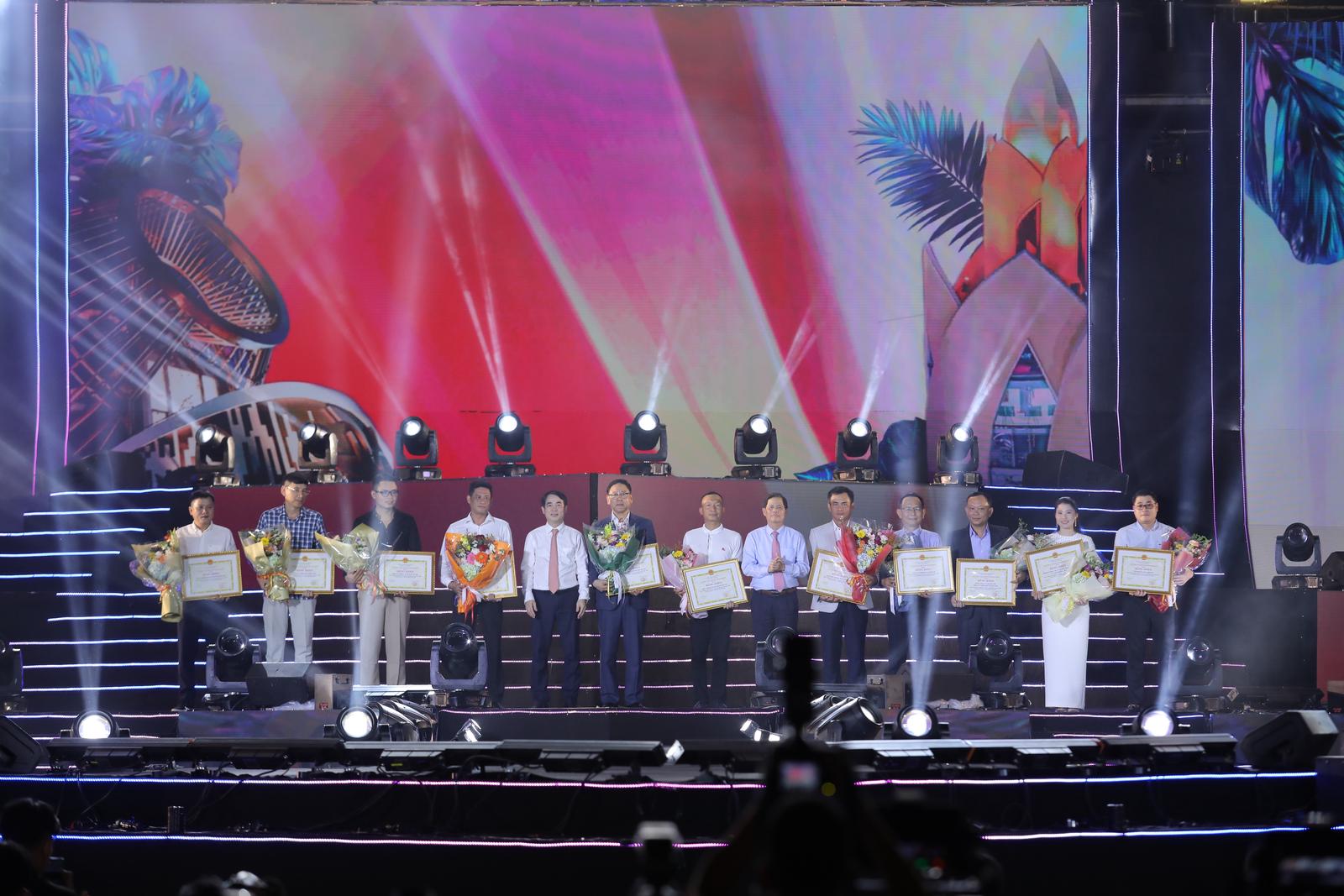 Lãnh đạo Tỉnh ủy, UBND tỉnh Khánh Hòa tặng hoa tri ân các đơn vị tài trợ đã góp phần xây dựng và dẫn đến thành công của chương trình khai mạc. Ảnh: Ban Tổ chức
