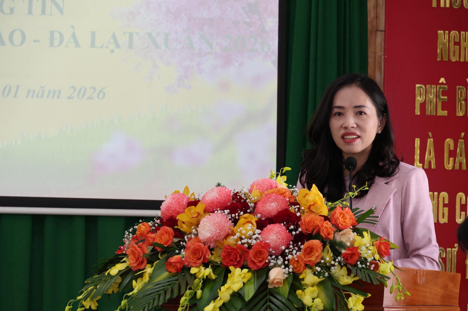 Bà Phan Thị Xuân Thảo, Phó Chủ tịch UBND phường Xuân Hương - Đà Lạt thông tin về Lễ hội hoa mai anh đào - Đà Lạt xuân 2026 tại buổi họp báo. Ảnh: Vũ Linh