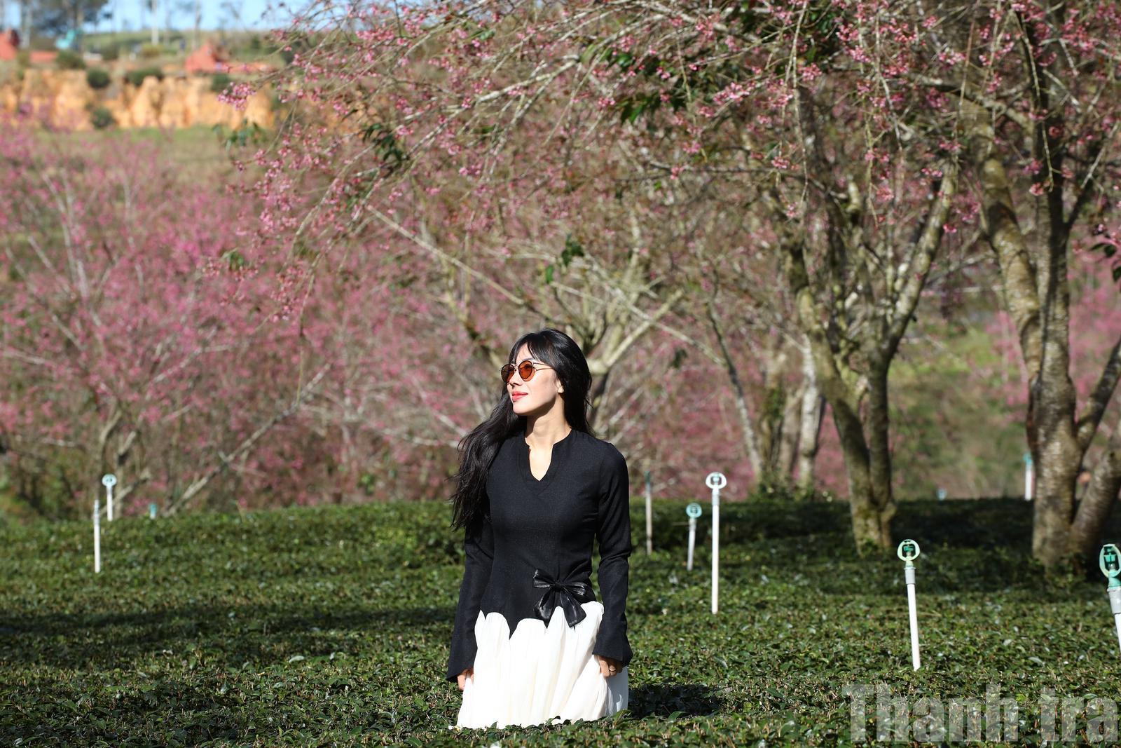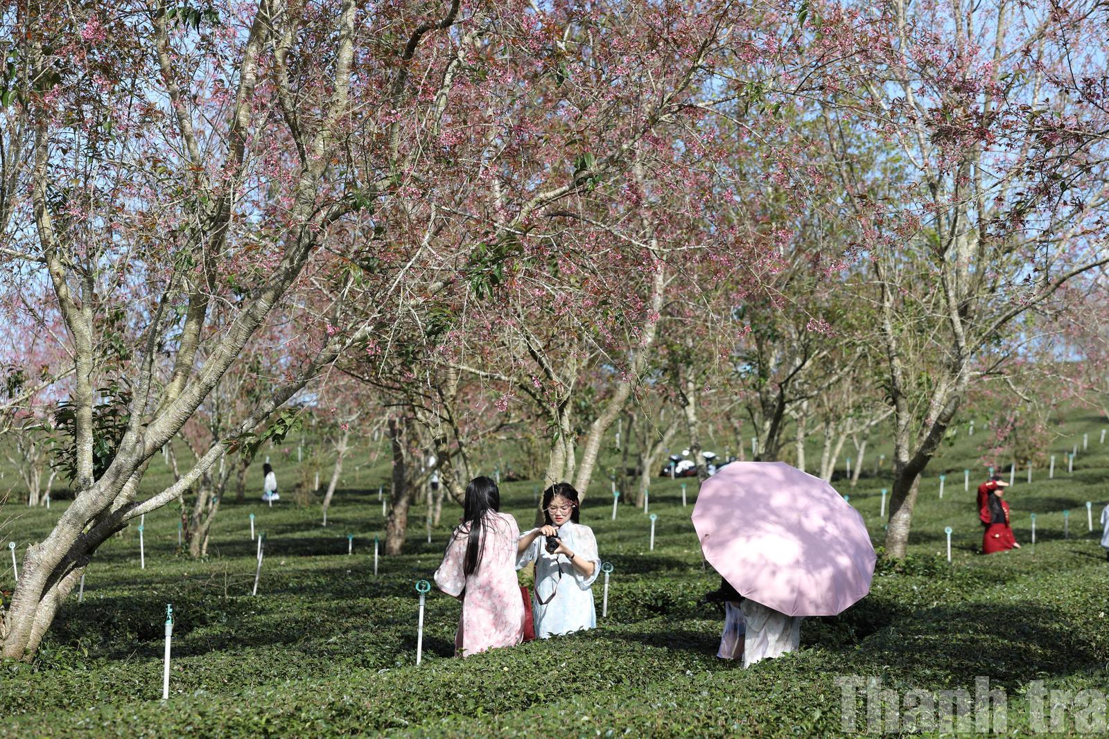 Tại vùng trà Cầu Đất, du khách được chiêm ngưỡng sắc hồng mai anh đào hòa quyện cùng đồi chè xanh mướt, tạo nên khung cảnh độc đáo của du lịch nông nghiệp mùa Xuân. Ảnh: Vũ Linh