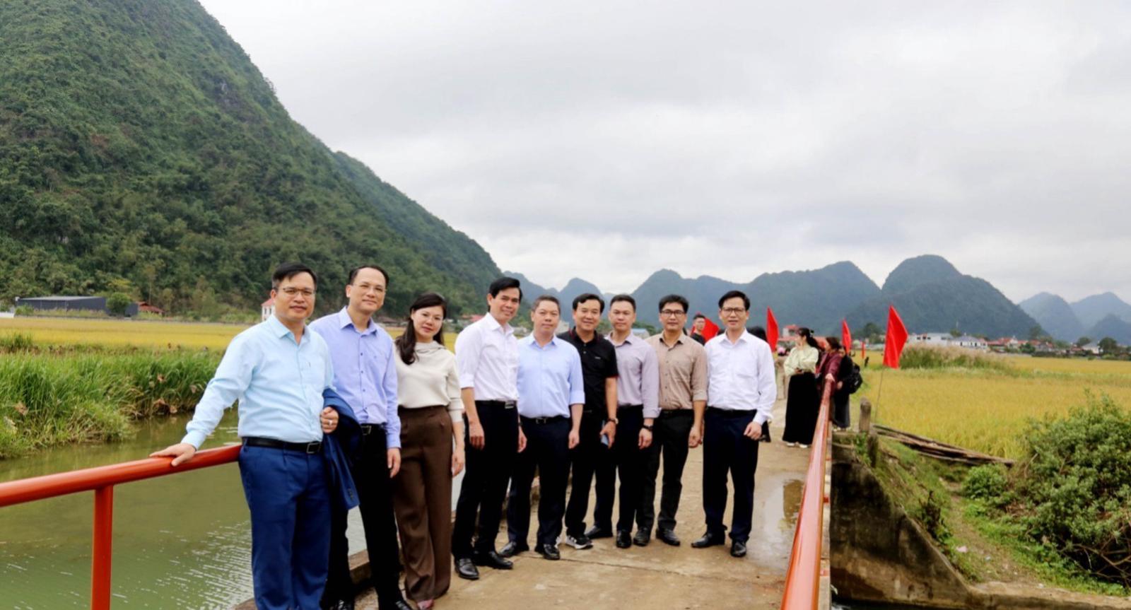Bí thư Tỉnh ủy Lạng Sơn Hoàng Quốc Khánh và lãnh đạo các sở, ngành chụp ảnh chung tại thung lũng lúa vàng Quỳnh Sơn. Ảnh: Trí Dũng
