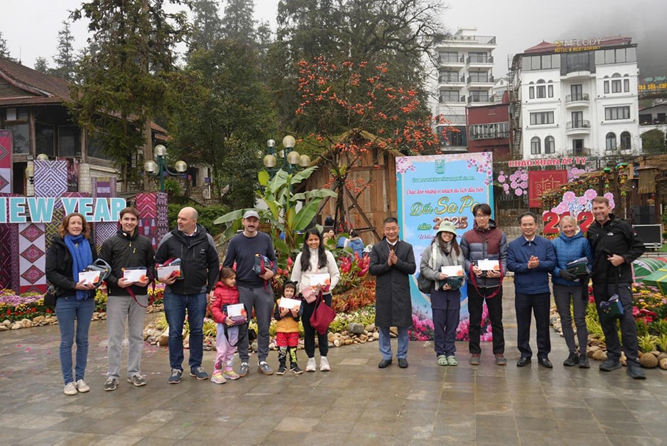 UBND thị xã Sa Pa và Hiệp hội Du lịch Lào Cai tặng quà cho các du khách "xông đất" đầu tiên năm 2025. Ảnh: ND