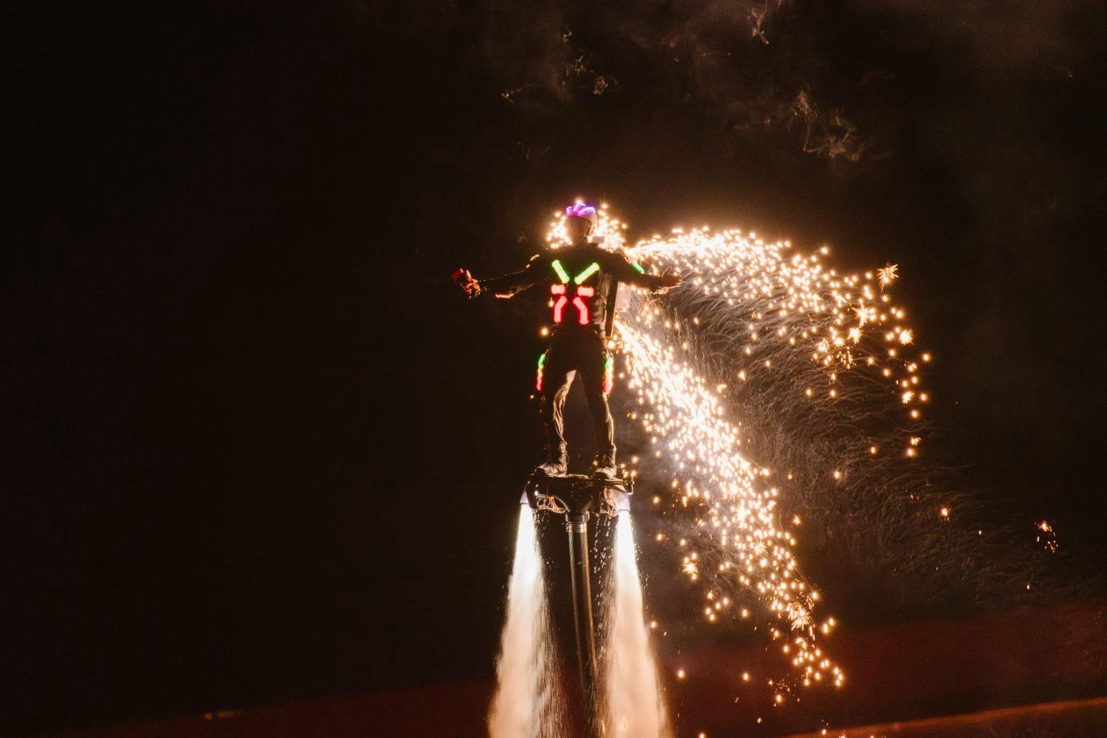 Điểm nhấn đặc biệt của Symphony of the Sea còn là sự kết hợp nhuần nhuyễn của 24 vận động viên thể thao mạo hiểm Flyboard và Jetski đẳng cấp quốc tế. Họ khoác lên mình những bộ trang phục LED độc đáo như những vì tinh tú trong đêm và mang trên mình đôi cánh pháo hoa, để lại những dải ánh sáng rực rỡ.