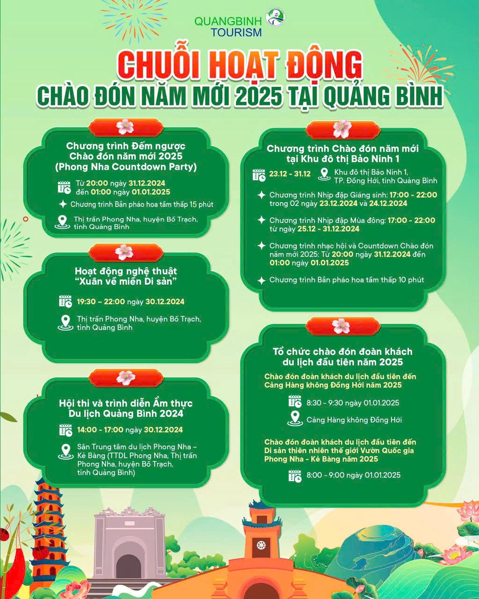 Vào đêm cuối cùng của năm sẽ là Chương trình đếm ngược chào đón năm mới 2025 (Phong Nha Countdown Party 2025), diễn ra từ 20 giờ đến 1 giờ 00 ngày 1/1/2025.