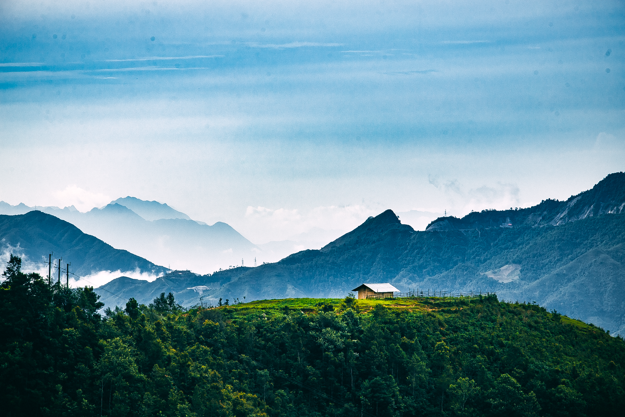 Đứng từ sân, nhìn ra phía xa, núi nối tiếp nhau, chồng lớp lớp như dải lụa xanh lẫn vào màn sương trắng. Từng giọt sương li ti đọng trên kẽ lá, sóng ánh theo nắng bình minh dịu nhẹ, thơm hăng và tươi mới như vừa được gói về từ ruộng đồng.