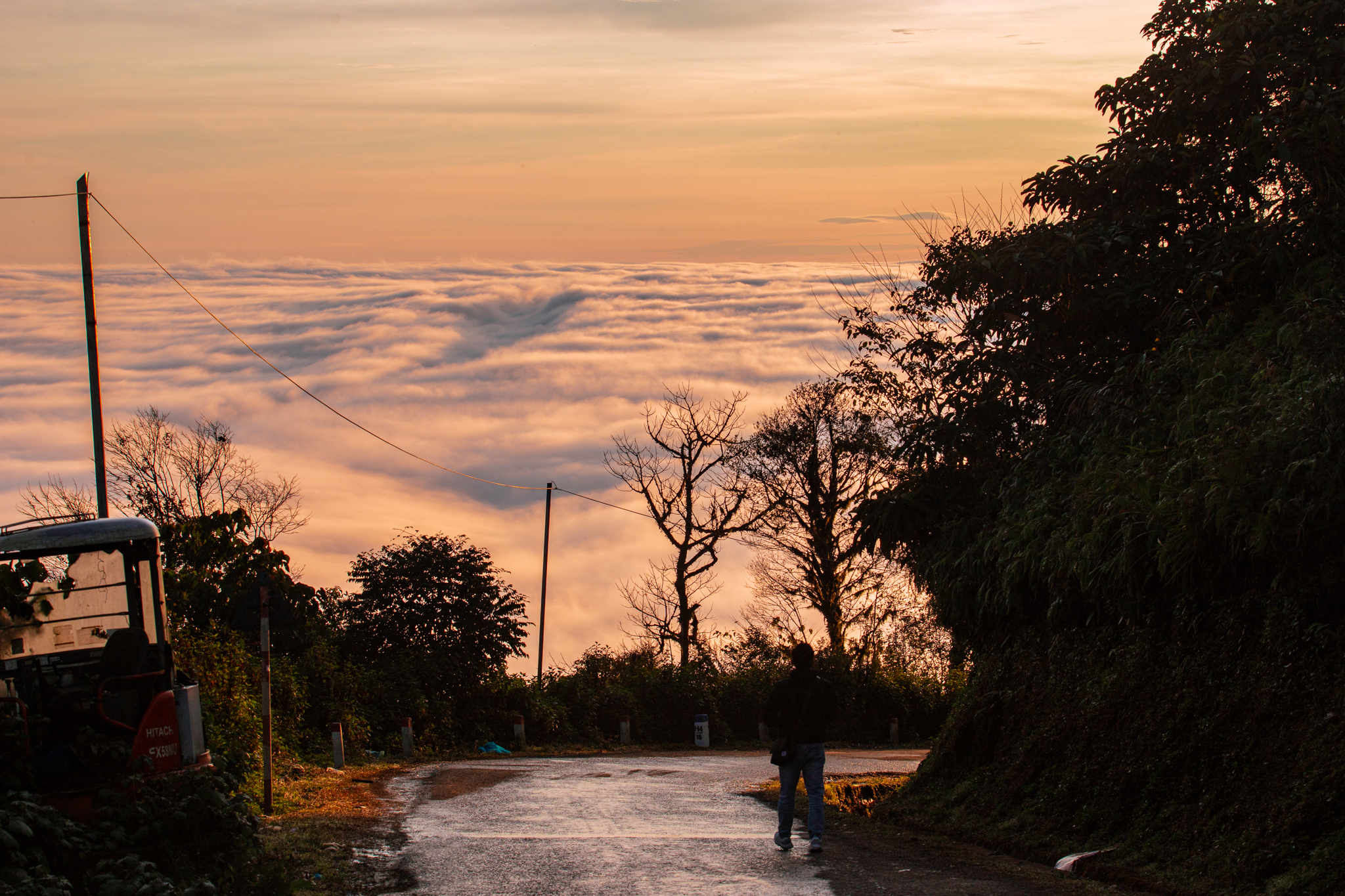 Nhưng có lẽ kỳ diệu nhất là lúc mây “thức giấc”. Ngước lên, mây trắng xóa đặc quánh, lọt qua những khoảng trống trong thung lũng, dâng lên che khuất cả lối đi.