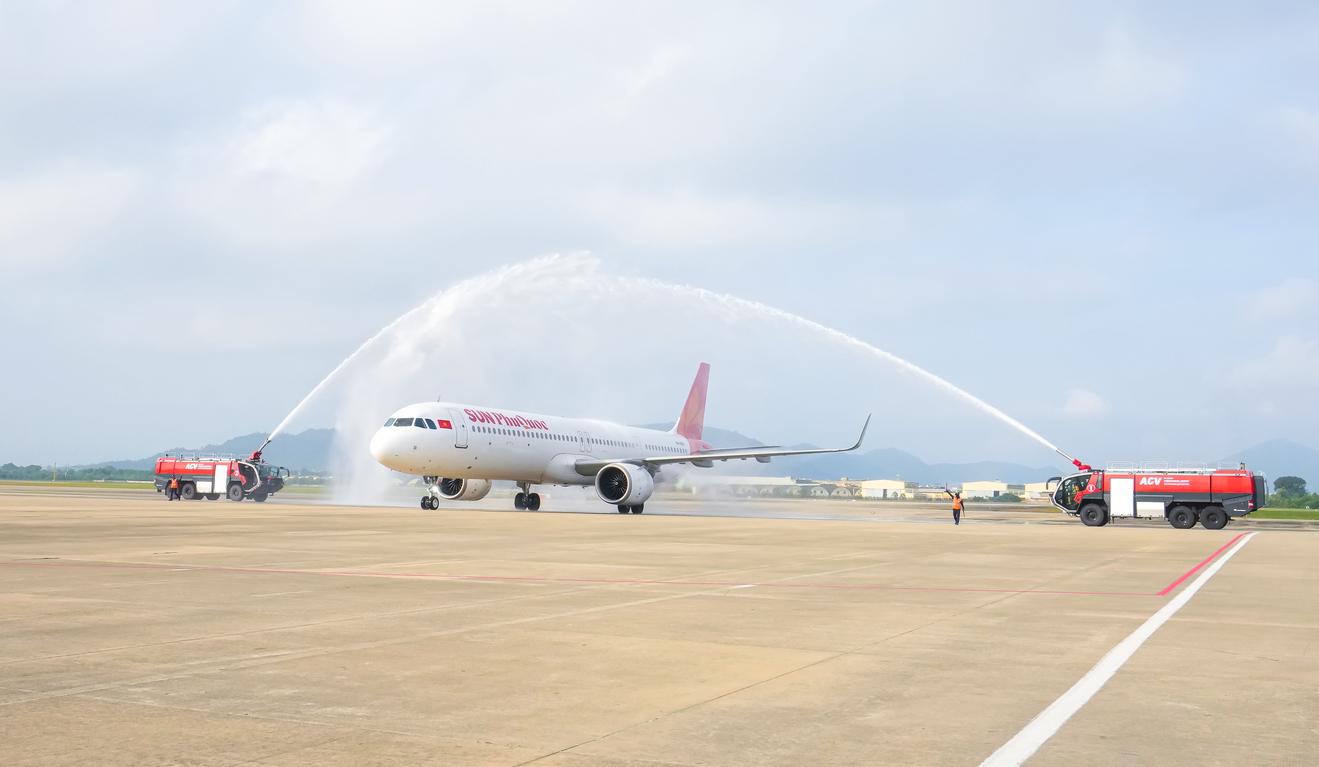 Chuyến bay đầu tiên của Sun PhuQuoc Airways hạ cánh xuống sân bay Đà Nẵng. Ảnh: Hương Mai