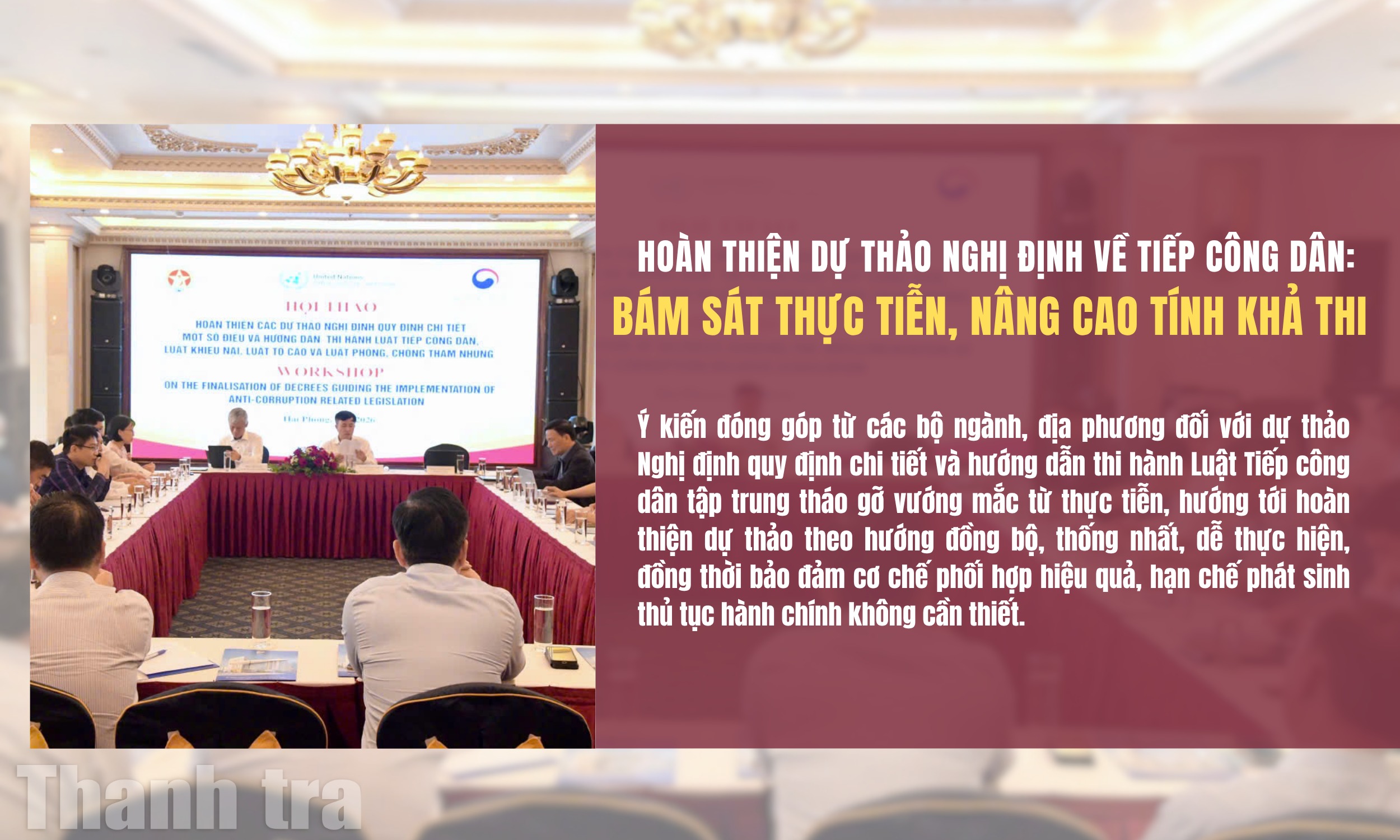 Hội thảo hoàn thiện các dự thảo Nghị định quy định chi tiết một số điều và hướng dẫn thi hành Luật Tiếp công dân, Luật Khiếu nại, Luật Tố cáo và Luật Phòng, chống tham nhũng do Thanh tra Chính phủ phối hợp với Cơ quan Phòng, chống ma túy và tội phạm của Liên hợp quốc (UNODC) tổ chức ngày 31/3, ghi nhận các ý kiến đóng góp từ các cơ quan, bộ, ngành Trung ương; các đơn vị thuộc Thanh tra Chính phủ; thanh tra các bộ, ngành, địa phương.