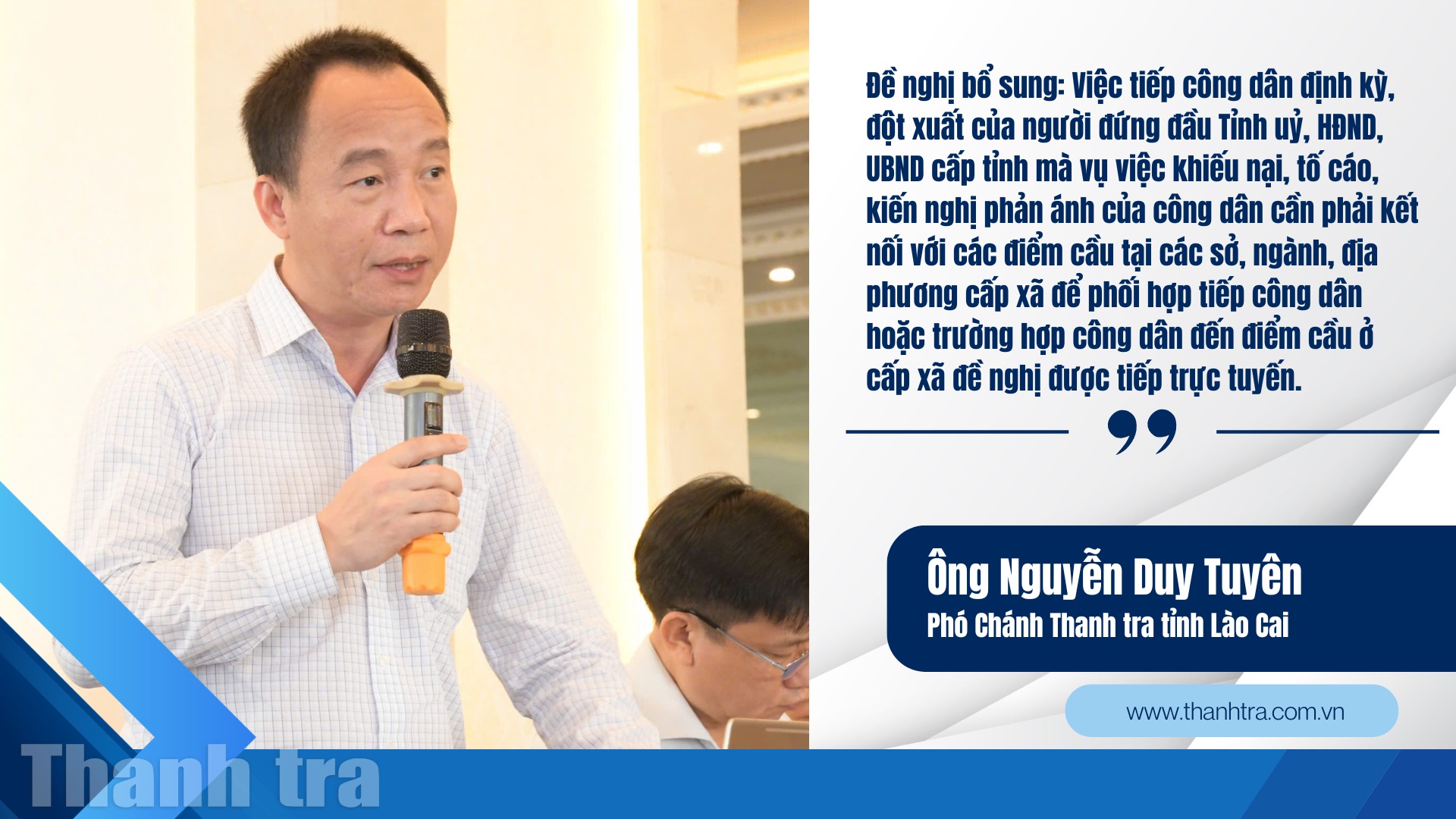 Phó Chánh Thanh tra tỉnh Lào Cai cũng đề nghị bổ sung quy định cho phép tiếp công dân trực tiếp kết hợp trực tuyến đối với các buổi tiếp dân định kỳ, đột xuất của lãnh đạo cấp tỉnh.