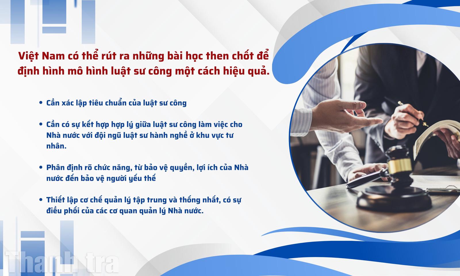 Từ kinh nghiệm của các quốc gia trên thế giới cho thấy việc hình thành luật sư công là yêu cầu cấp thiết nhằm thể chế hóa chủ trương, chính sách của Đảng, Nhà nước, đồng thời đáp ứng yêu cầu của thực tiễn. Mô hình luật sư công cần hướng tới sự tinh gọn, không làm phát sinh biên chế bằng cách tối ưu hóa lực lượng sẵn có.