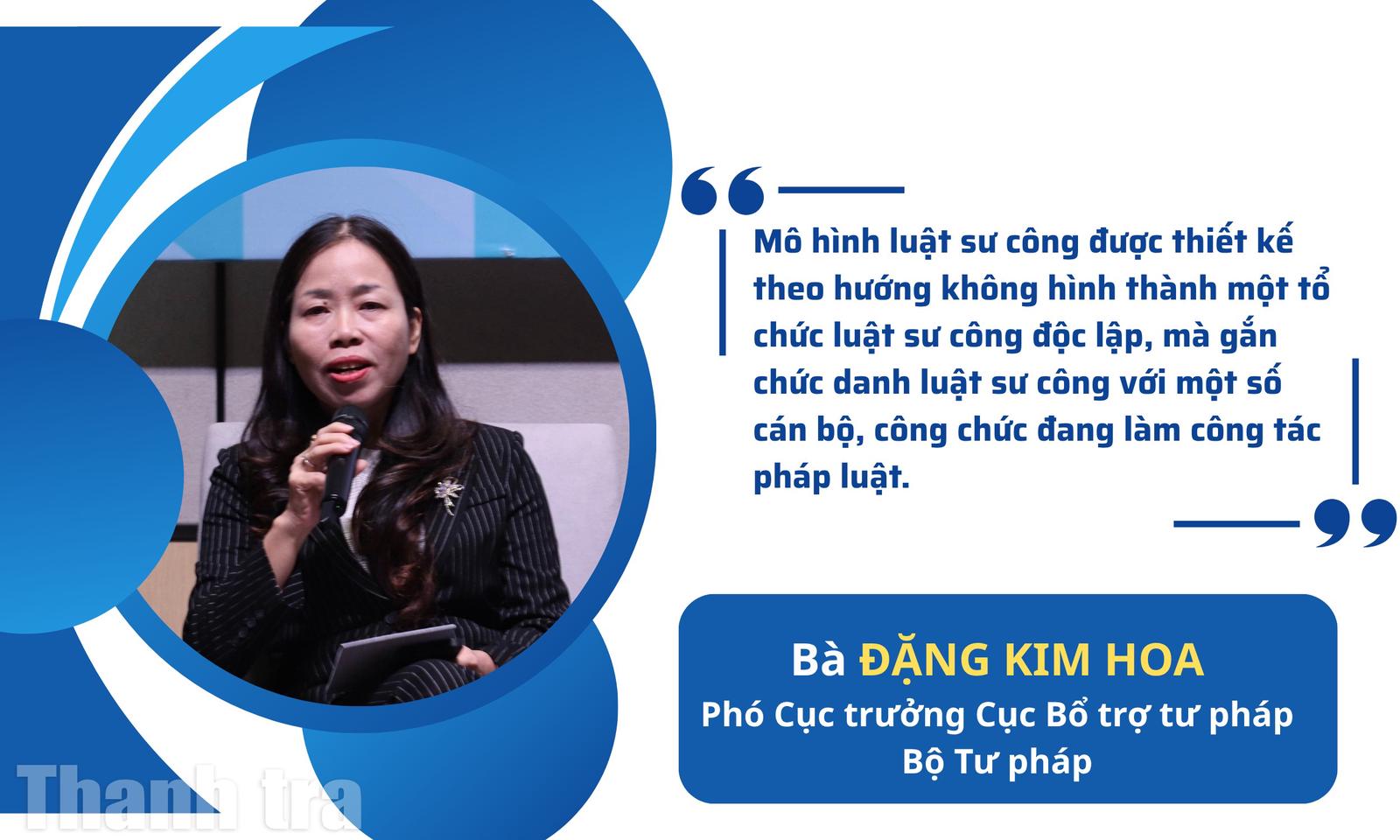 Bà cho rằng, mô hình được thiết kế theo hướng không hình thành một tổ chức luật sư công độc lập, mà gắn chức danh luật sư công với một số cán bộ, công chức đang làm công tác pháp luật. Điều này đồng nghĩa với việc luật sư công vừa phải tuân thủ trách nhiệm của cán bộ, công chức, vừa phải tuân thủ chuẩn mực nghề luật sư.