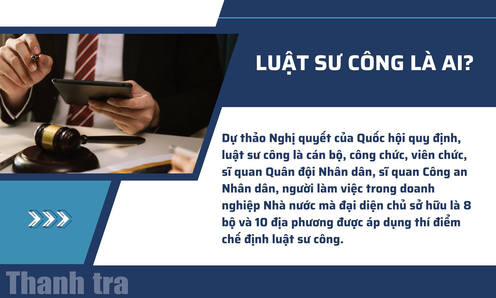 Dự thảo quy định, luật sư công là cán bộ, công chức, viên chức, sĩ quan Quân đội Nhân dân, sĩ quan Công an Nhân dân, người làm việc trong doanh nghiệp Nhà nước mà đại diện chủ sở hữu là 8 bộ và 10 địa phương nêu trên được cấp Chứng chỉ hành nghề luật sư để thực hiện các công việc có tính chất pháp lý nhằm bảo vệ quyền và lợi ích hợp pháp của cơ quan Nhà nước, cơ quan, tổ chức thuộc hệ thống chính trị, doanh nghiệp Nhà nước theo quy định của Nghị quyết này và quy định khác của pháp luật có liên quan. Tuy nhiên, luật sư công không bao gồm các viên chức đang thực hiện trợ giúp pháp lý.