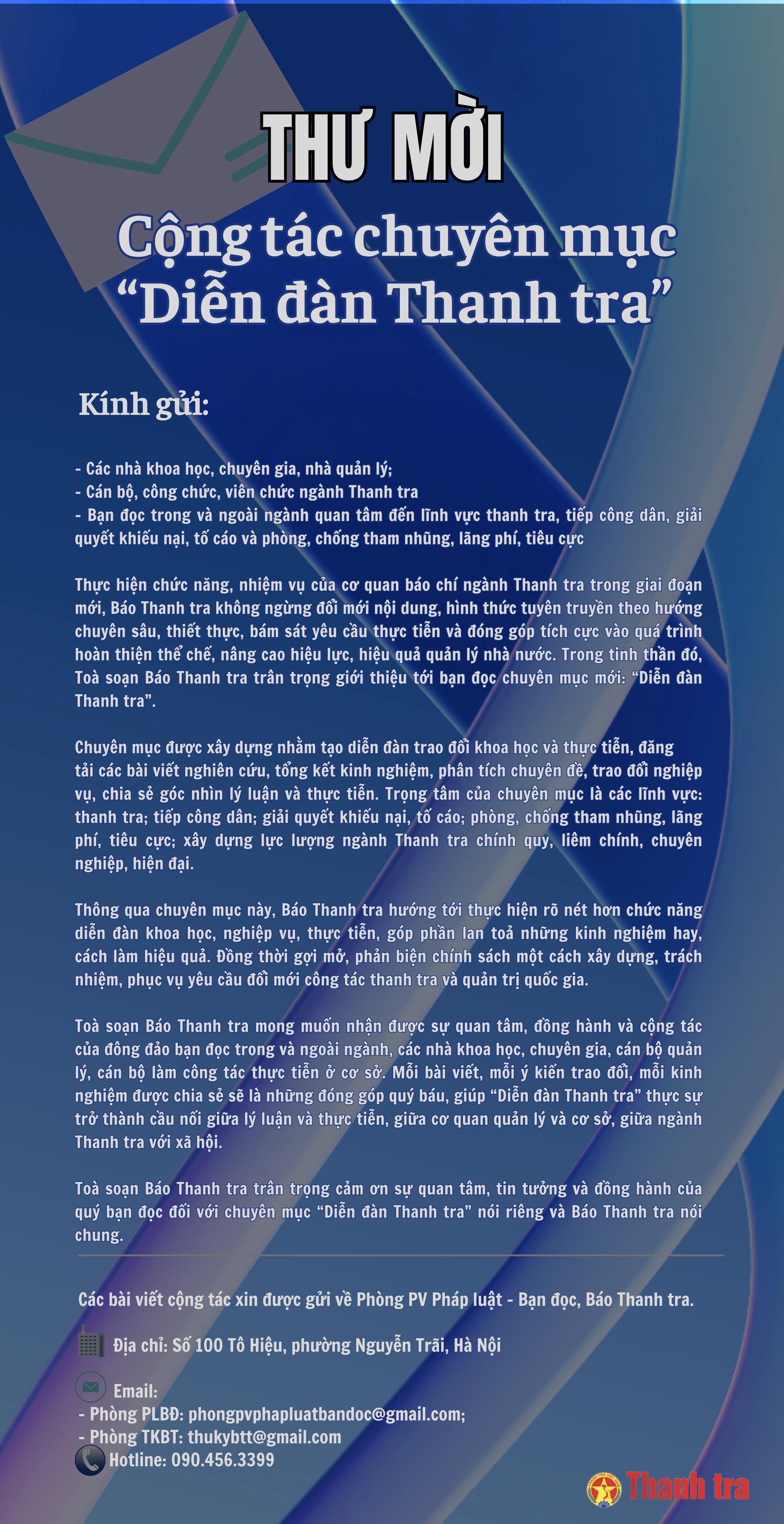 (Thanh tra) - Mỗi bài viết, mỗi ý kiến trao đổi, mỗi kinh nghiệm được chia sẻ sẽ là những đóng góp quý báu, giúp “Diễn đàn Thanh tra” thực sự trở thành cầu nối giữa lý luận và thực tiễn, giữa cơ quan quản lý và cơ sở, giữa ngành Thanh tra với xã hội.