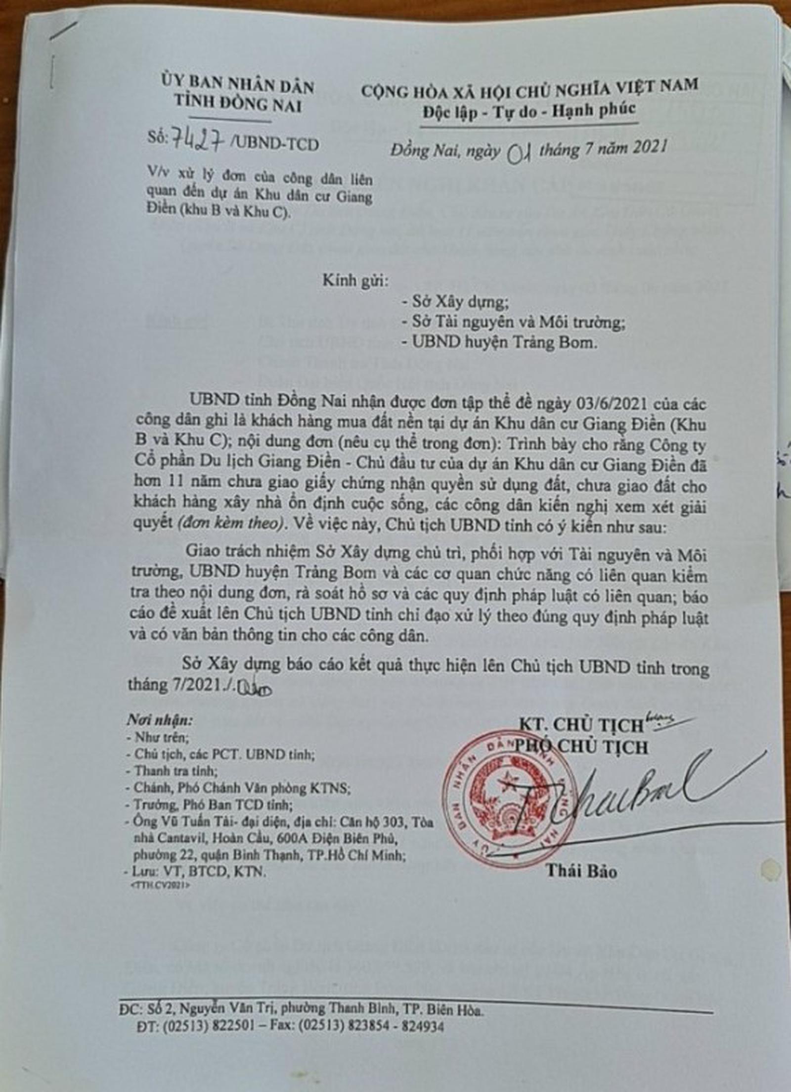 Công văn của UBND tỉnh Đồng Nai chỉ đạo về việc xử lý đơn thư công dân liên quan đến dự án khu dân cư Giang Điền. Ảnh: Nguyên Dũng