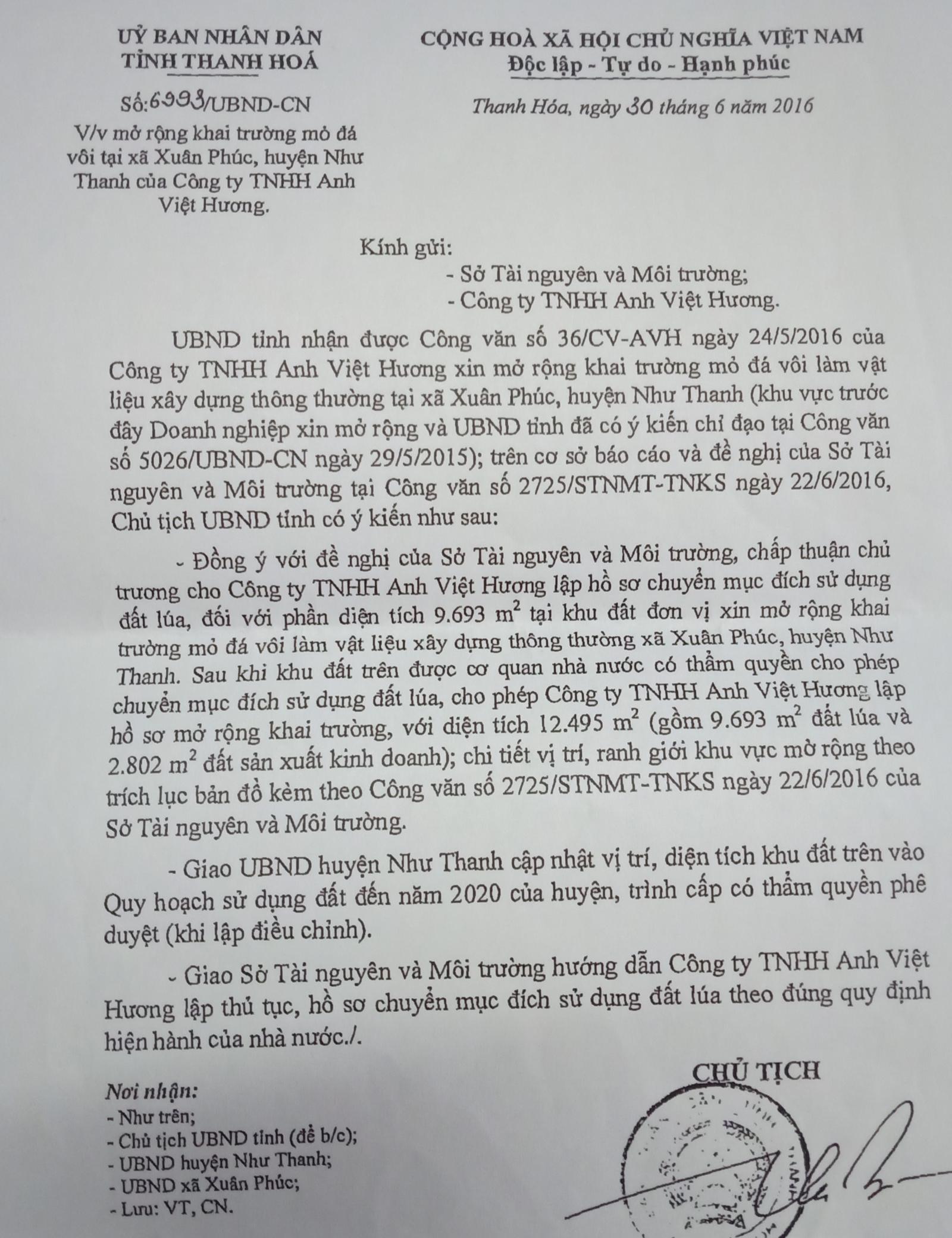 Cũng liên quan đến việc chấp hành pháp luật về đất đai, ngày 28/2/2017, UBND tỉnh Thanh Hóa đã có Văn bản số 1932/UBND-CN về việc chấp thuận chủ trương, địa điểm xây dựng kho chứa vật liệu nổ Công nghiệp ở xã Xuân Phúc, huyện Như Thanh cho Cty Anh Việt Hương. Vị trí, diện tích đất thuộc thửa đất số 01, tờ bản đồ số 02, bản đồ địa chính xã Xuân Phúc đo vẽ năm 2007, tỷ lệ 1/2000. Hiện trạng khi chấp thuận là đất đang trồng sắn, keo do UBND xã quản lý đã giao cho các hộ dân.