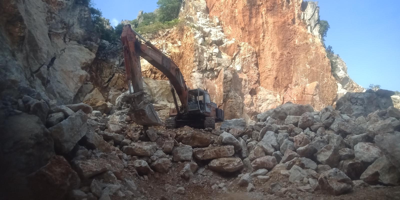 Máy móc được đưa đến khai thác đá trái phép giữa ban ngày, khiến nguồn tài nguyên ở thung Chuối bị cạn kiệt, thất thoát nguồn thuế của Nhà nước. Ảnh: Xuân Thống
