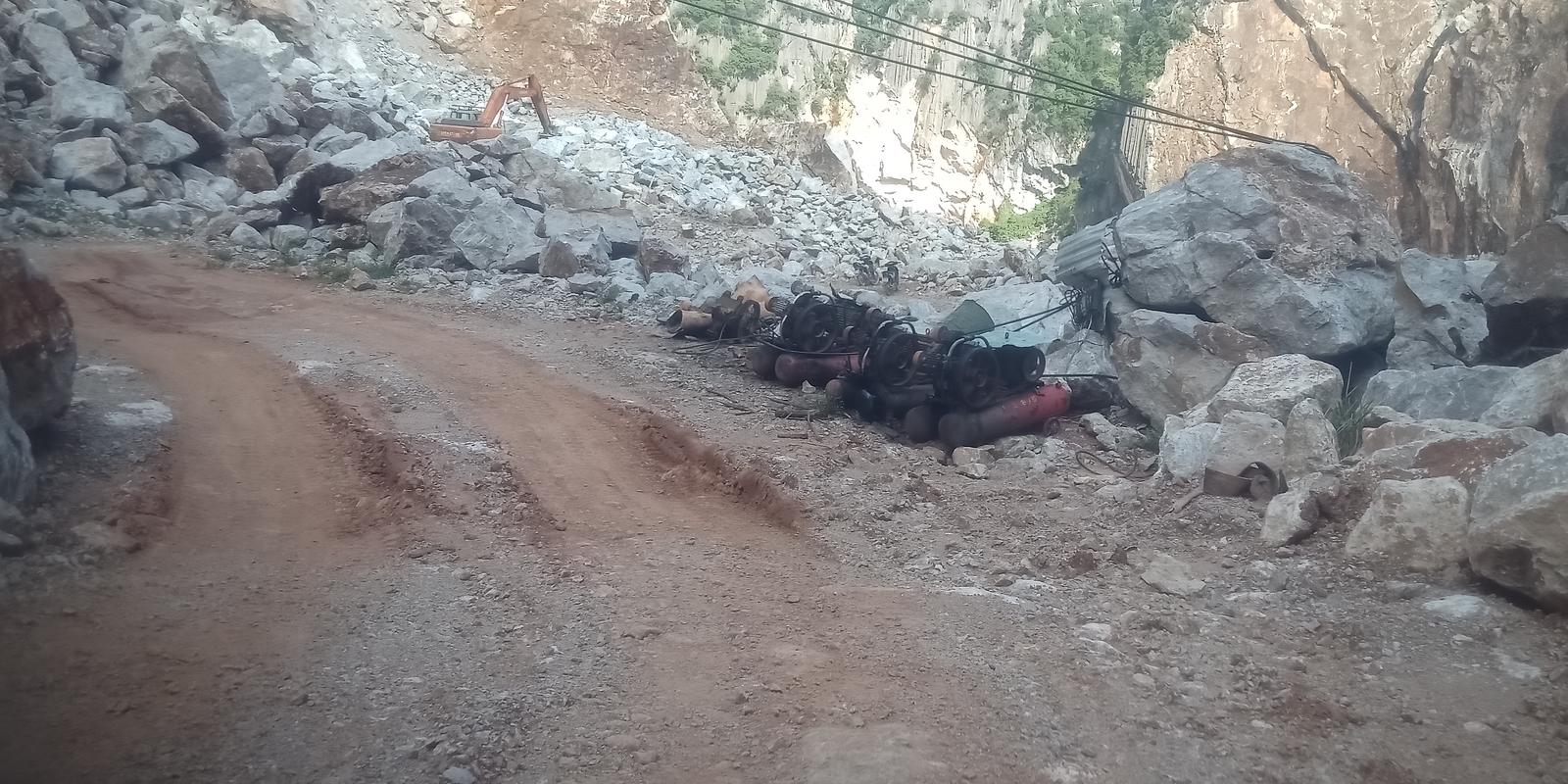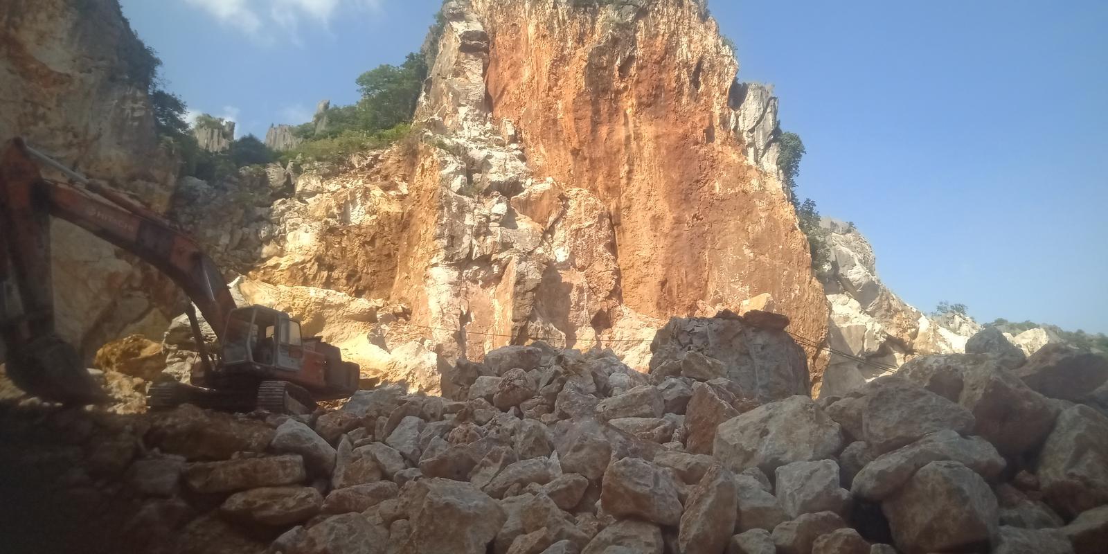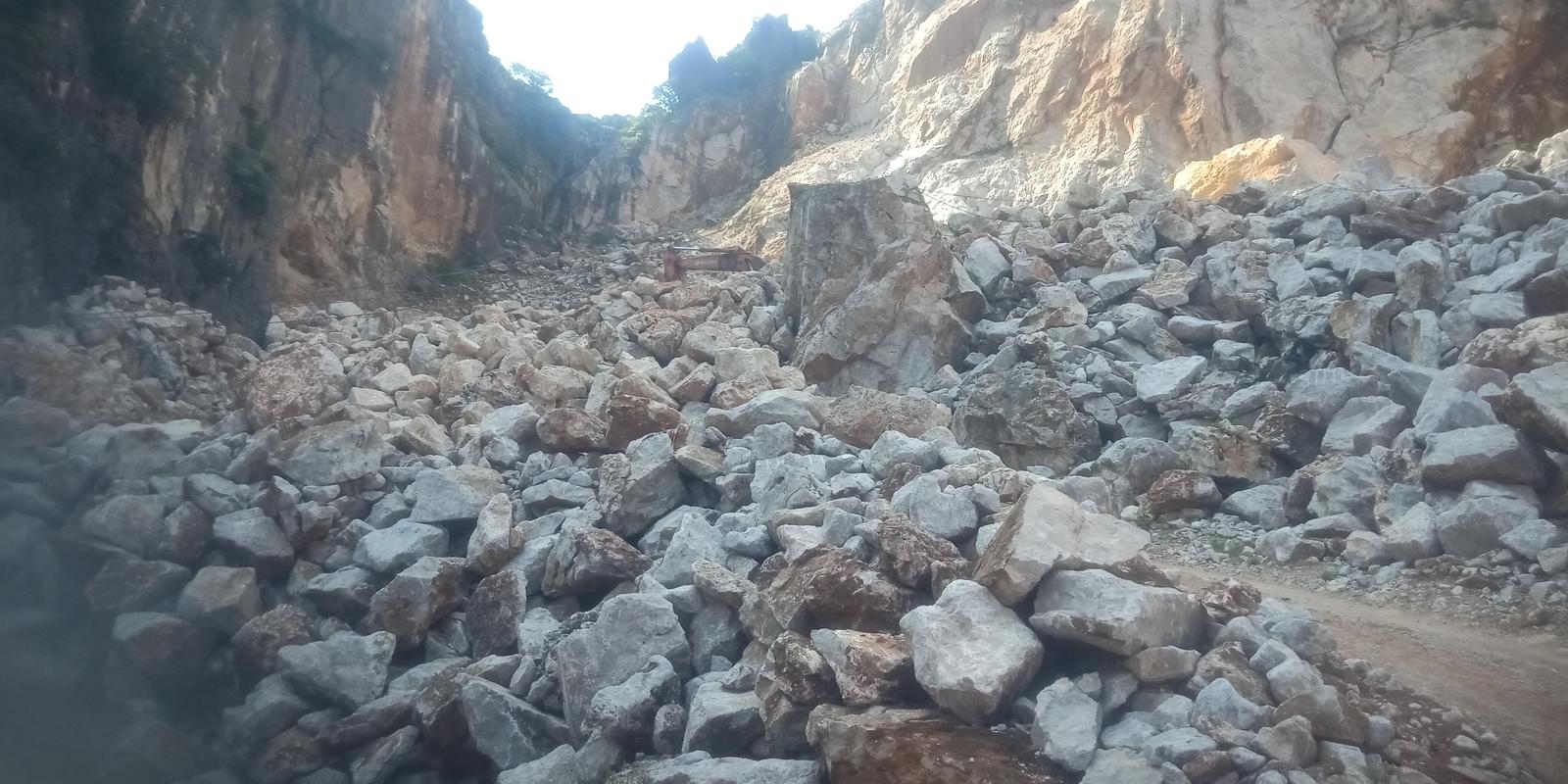 Đá được thổ phỉ nổ mìn đánh xuống thung Chuối để vận chuyển xuống chân núi xay nghiền trái phép. Ảnh: Xuân Thống