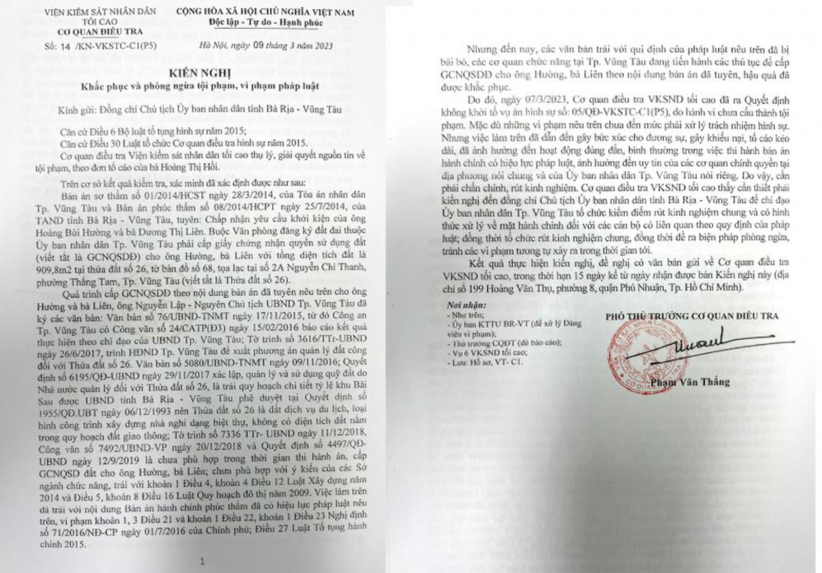 “Cơ quan Điều tra, Viện KSND Tối cao thấy cần thiết phải kiến nghị đến Chủ tịch UBND tỉnh Bà Rịa - Vũng Tàu để chỉ đạo UBND TP Vũng Tàu tổ chức kiểm điểm rút kinh nghiệm chung và có hình thức xử lý về mặt hành chính đối với các cán bộ có liên quan theo quy định của pháp luật; đồng thời tổ chức rút kinh nghiệm chung, đề ra biện pháp phòng ngừa, tránh các vi phạm tương tự xảy ra trong thời gian tới”, công văn của Cơ quan Điều tra, Viện KSND Tối cao nêu rõ.