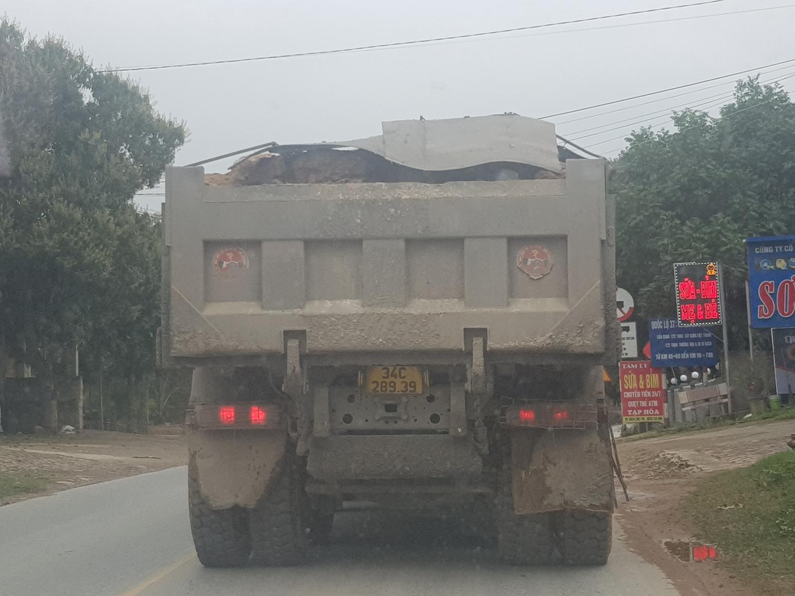 Xe ô tô chở đất từ mỏ đất của Công ty TNHH Hoàng Dương be bịt sơ sài, tiềm ẩn nguy cơ rơi vãi, mất an toàn giao thông cho người đi đường. Ảnh: Chính Công