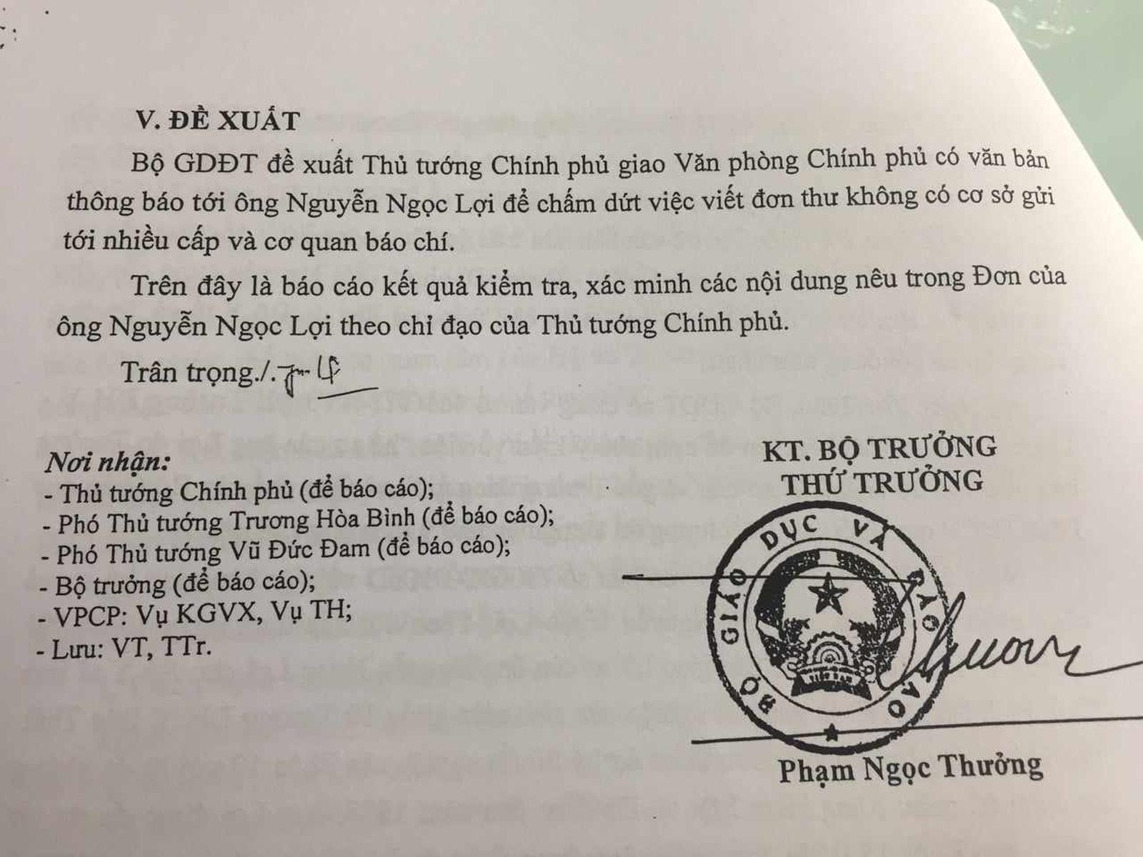 Văn bản cho biết, hiện nay ông Nguyễn Ngọc Lợi có đơn gửi Thủ tướng Chính phủ và Phó Thủ tướng Lê Minh Khái đề nghị có ý kiến chỉ đạo để Bộ GDĐT vận dụng các luật lệ, quy định của Nhà nước trích ngân sách phục hồi mọi quyền lợi chính đáng hợp pháp của cán bộ mất việc do bị xử lý oan sai.