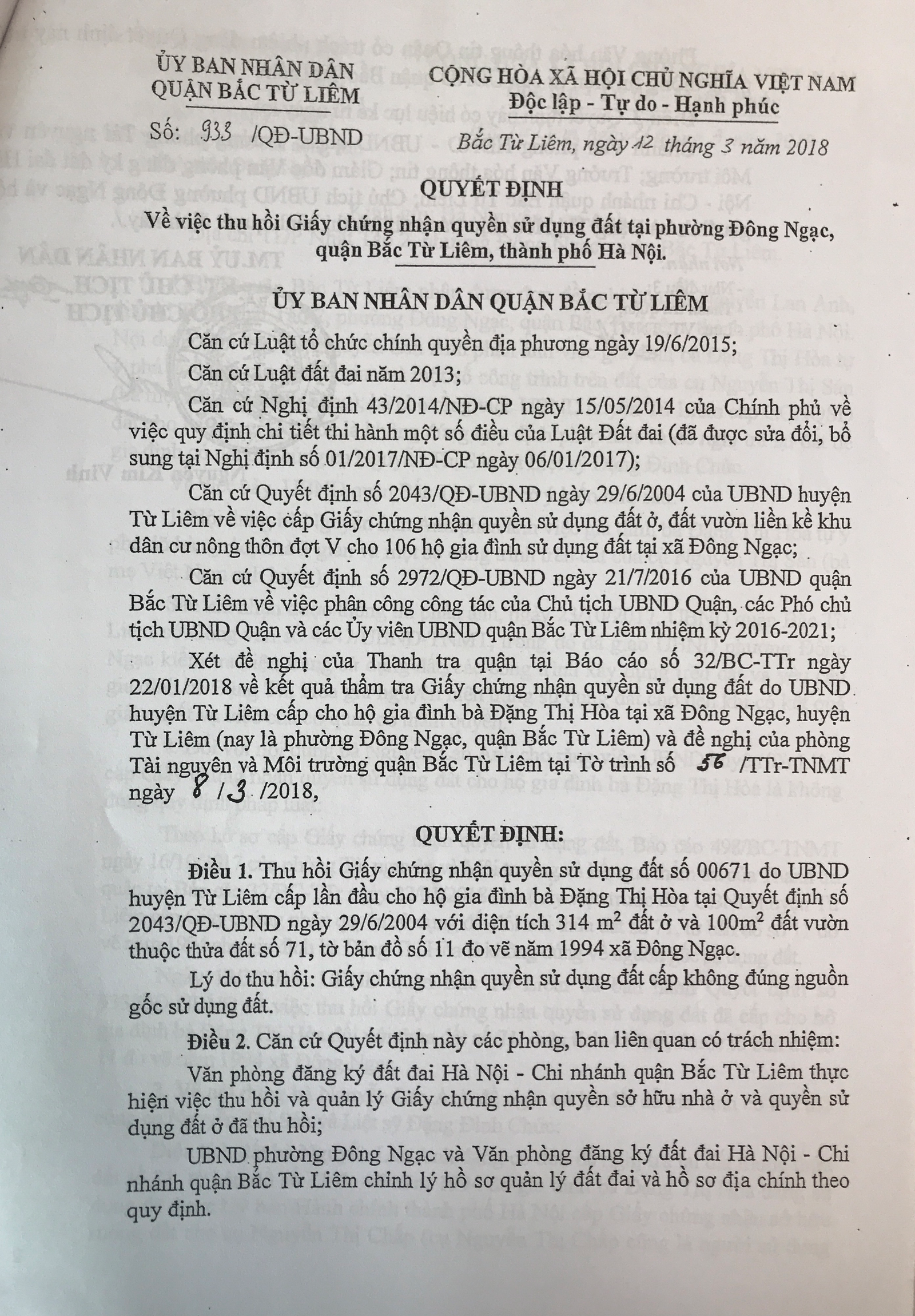 Cũng trong năm 2018, Chủ tịch UBND quận Bắc Từ Liêm đã ban hành Quyết định số 933/QĐ-UBND ngày 12/3/2018 về việc thu hồi GCNQSDĐ tại phường Đông Ngạc. Theo đó, thu hồi GCNQSDĐ số 00671 do UBND huyện Từ Liêm cấp lần đầu cho hộ gia đình bà Đặng Thị Hòa tại Quyết định số 2043/QĐ-UBND ngày 29/6/2004 với diện tích 314m2 đất ở và 100m2 đất vườn thuộc thửa đất só 71, tờ bản đồ số 11 đo vẽ năm 1994 xã Đông Ngạc. Lý do thu hồi: GCNQSDĐ cấp không đúng nguồn gốc. Trách nhiệm nội dung này cũng được chỉ ra thuộc về ông Nguyễn Văn Bân - cán bộ địa chính và ông Nguyễn Văn Chiến - Chủ tịch UBND xã.