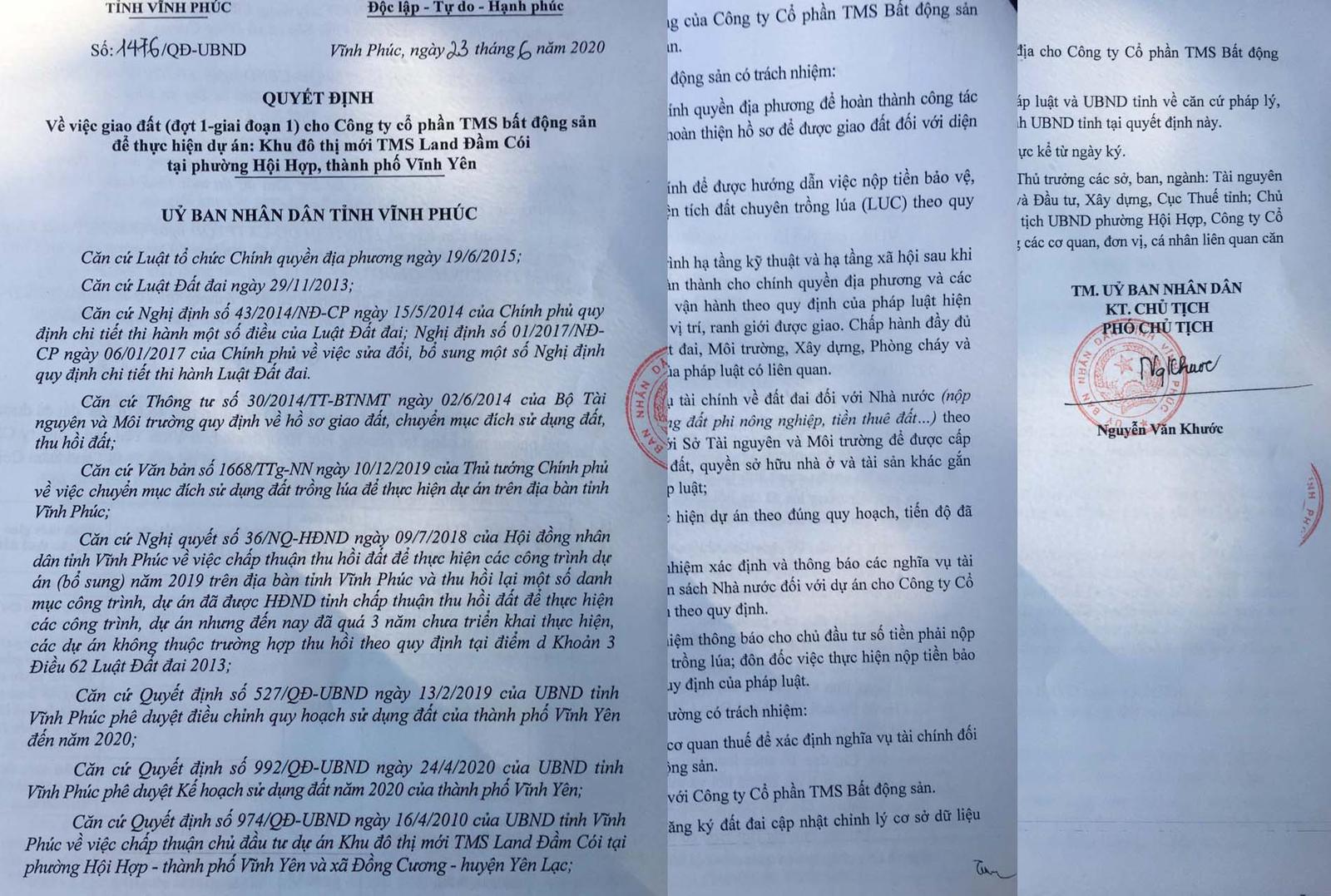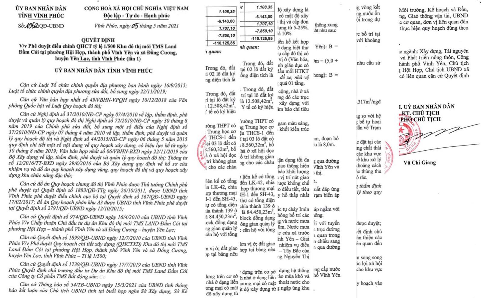 Cụ thể, Dự án TMS Land Đầm Cói được UBND tỉnh Vĩnh Phúc chấp thuận chủ trương đầu tư tại Quyết định số 974/QĐ-UBND ngày 16/4/2010. Đến ngày 12/7/2010, UBND tỉnh Vĩnh Phúc tiếp tục ban hành Quyết định số 1899/QĐ-UBND về việc phê duyệt quy hoạch chi tiết xây dựng Khu đô thị mới TMS Land Đầm Cói tại phường Hội Hợp, thành phố Vĩnh Yên và xã Đồng Cương, huyện Yên Lạc, tỉnh Vĩnh Phúc - tỉ lệ 1/500.